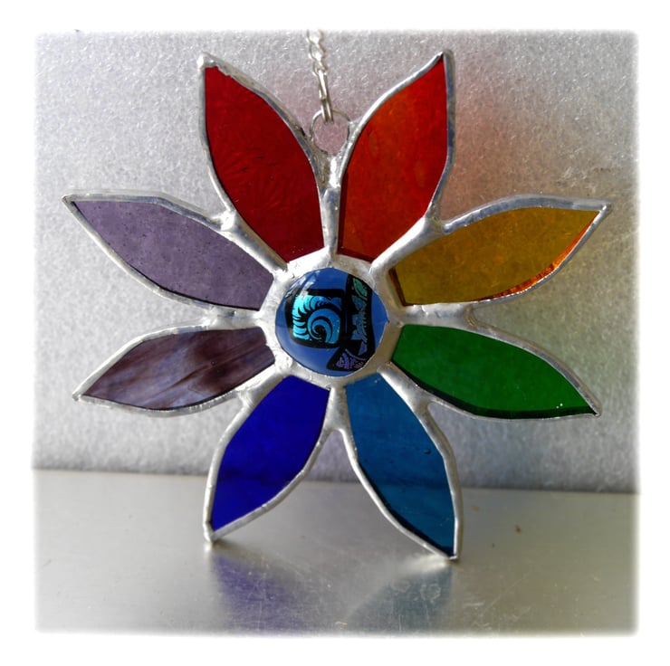 A variation of my other daisies but this one in rainbow shades with an extra special centre, a pretty glass nugget which I fused in my kiln with dichroic glass added for extra sparkle.