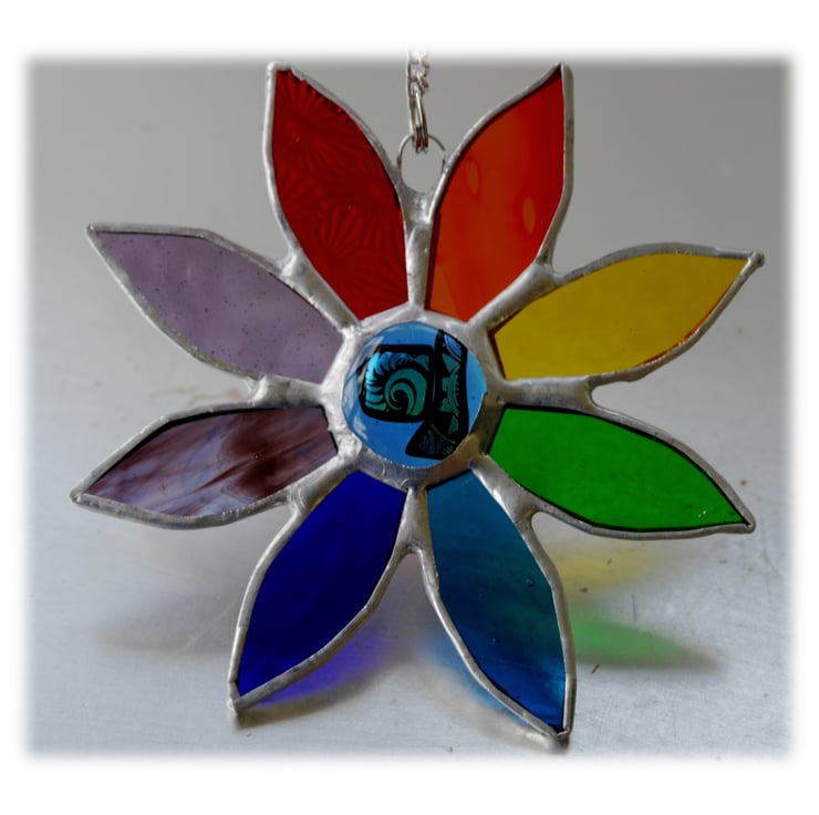 This daisy has 8 different coloured petals, lots of lovely textures in the glass, a rainbow array and is beautifully bright.