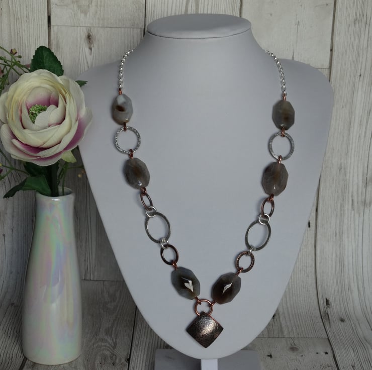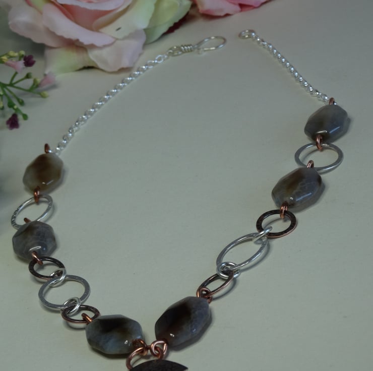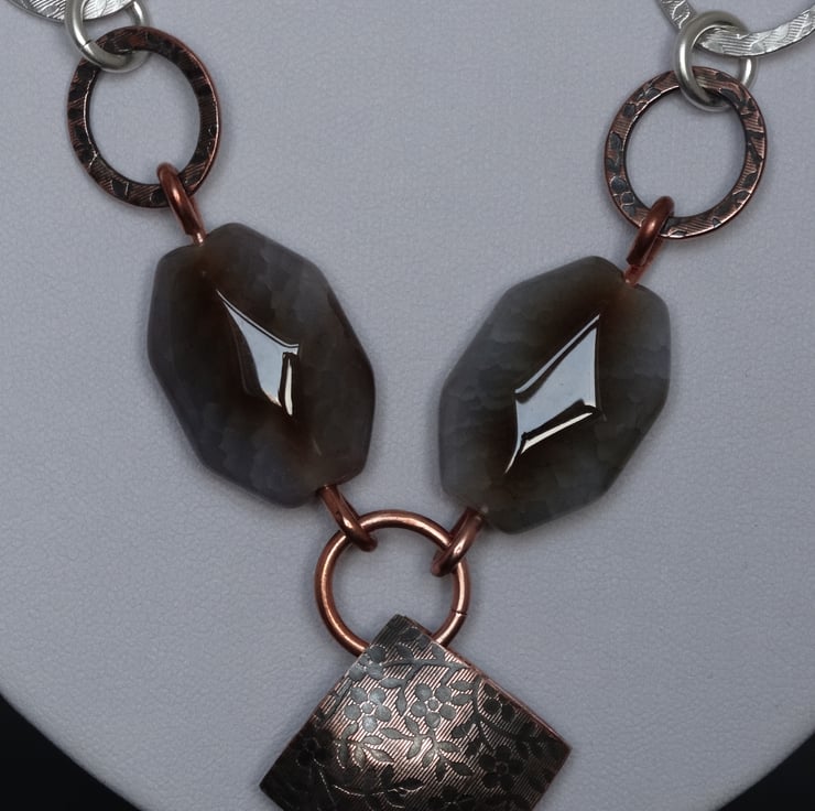 This chunky necklace has 6 large crackled agate beads which have a back ground grey colour with brown patches. In between the beads are a mixture of silver and copper ovals that compliment the grey and brown colour of the beads. A handmade copper square cushion beads hangs from the bottom of the necklace. This cushion bead has been embossed with a floral pattern which is also picked up in the the oval spacers.