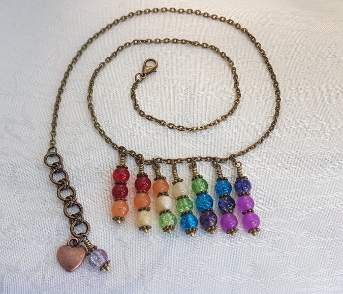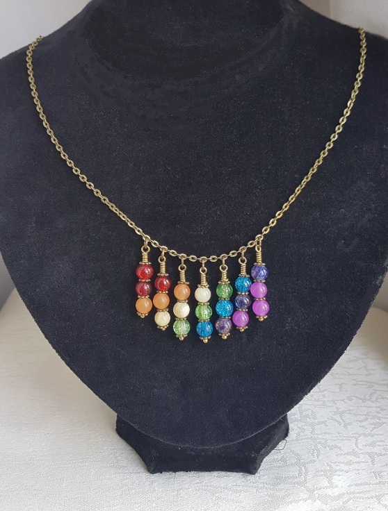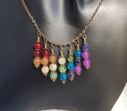 A fabulous array of rainbow beads dangle from an antique bronze tone chain. An unusual piece of handmade jewellery and a unique gift. A mix of crackle glass and gemstone beads make up the bright spectrum of colour that flashes at the front of this necklace.