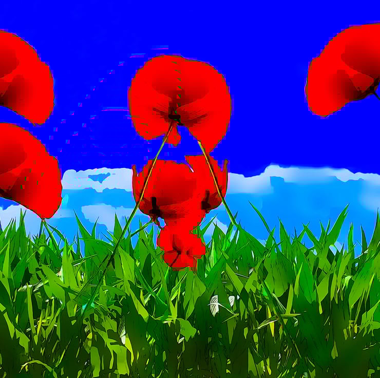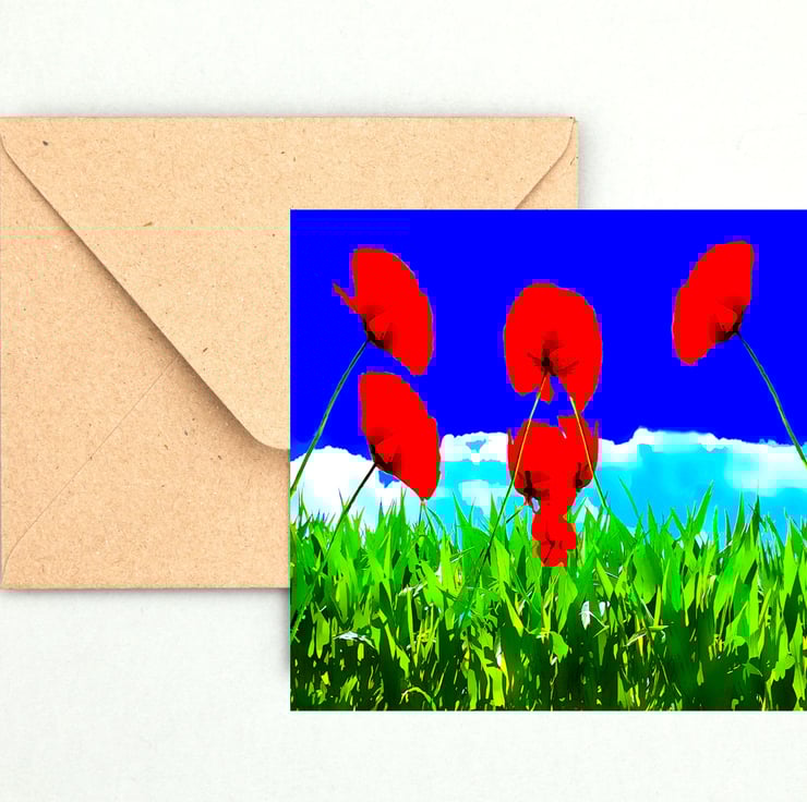 This is a lovely colourful Greeting Card. A Field of Poppies, in Green Grass