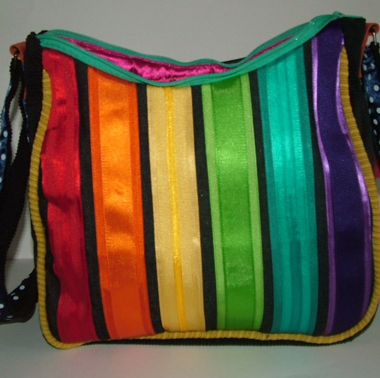 the back panel is also a blue denim panel this time overlaid with satin ribbon in 6 different colours to create a rainbow effect.