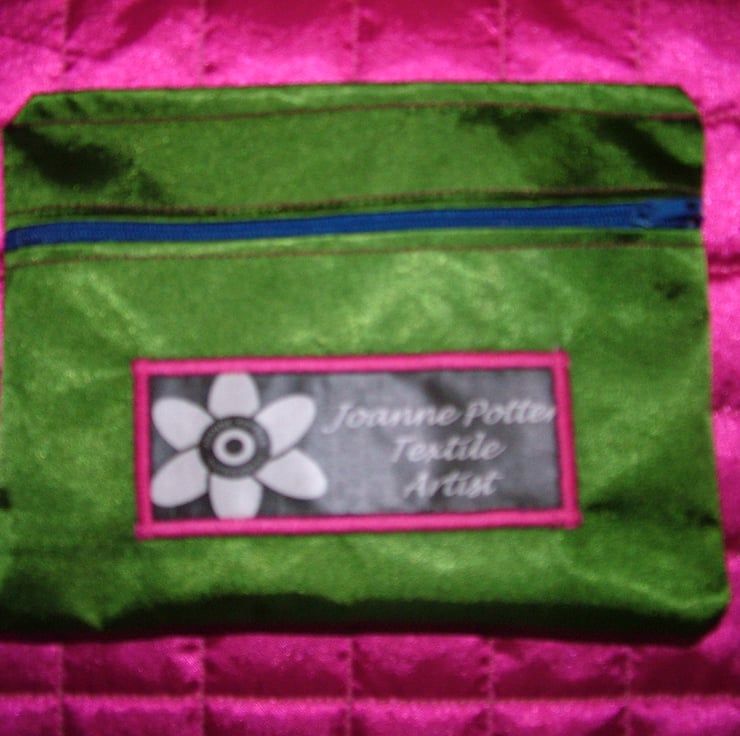 The bag fastens with a teal zip to reveal a hot pink quilted lining with a green inside pocket with makers label.