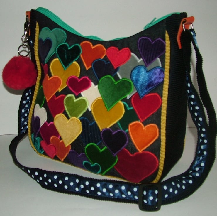 The front panel is a blue denim that has been overlaid with 35 velvet and corduroy hearts in many, many colours. Each heart has been appliqued with matching zig zag stitching.