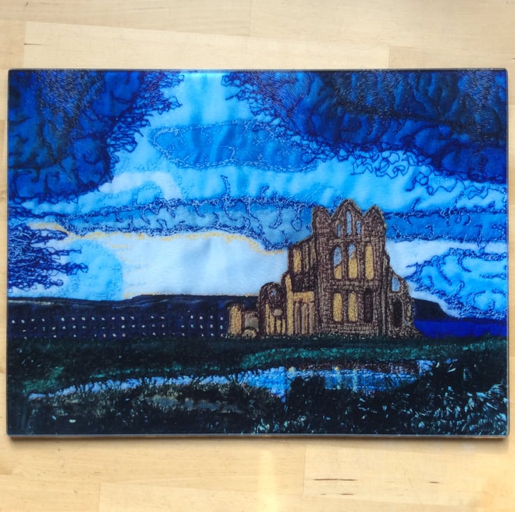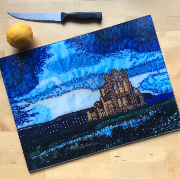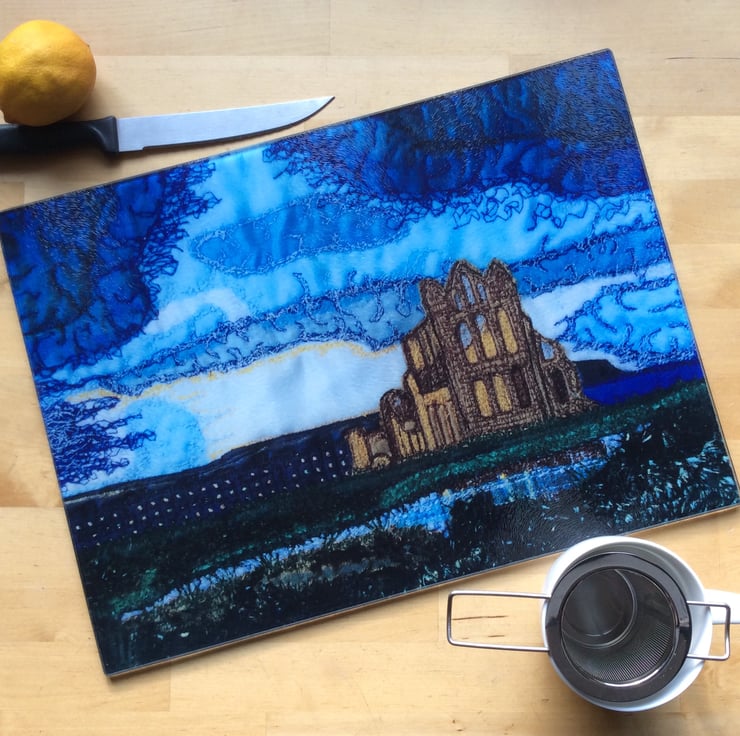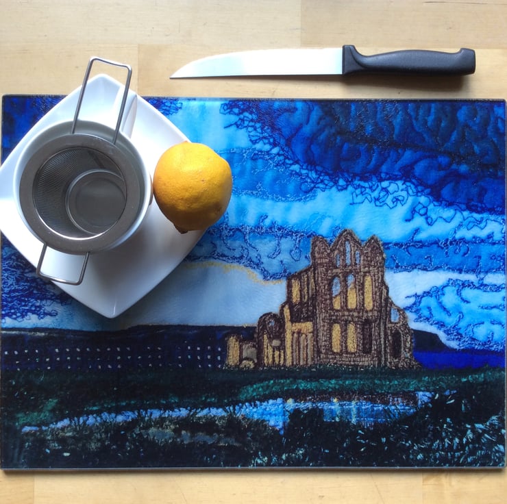 This unique glass chopping board has my textile landscape of Whitby Abbey, with its reflection in the pond and set against a sunset sky. The glass board is heat resistant, makes a perfect cheeseboard, work top saver and a stunning center piece for the table. Easily cleaned. Size A3 landscape.