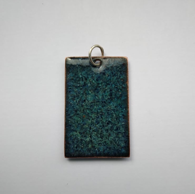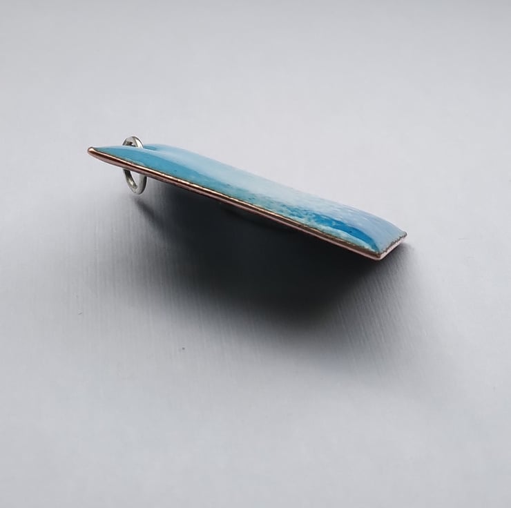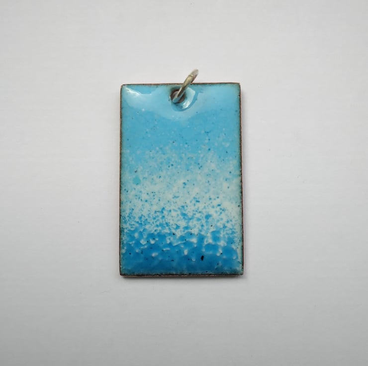 Rectangular enamelled copper pendant In shades of blue and white. The pendant has been kiln-fired and measures 19mm wide and 30mm tall. To complete the piece aesthetically and for a smooth finish against the skin, the back has been given two coats of dark blue tweed-effect enamel. It comes complete with a soldered sterling silver jump ring and is supplied with an 18" silver plated snake chain and a little organza pouch.