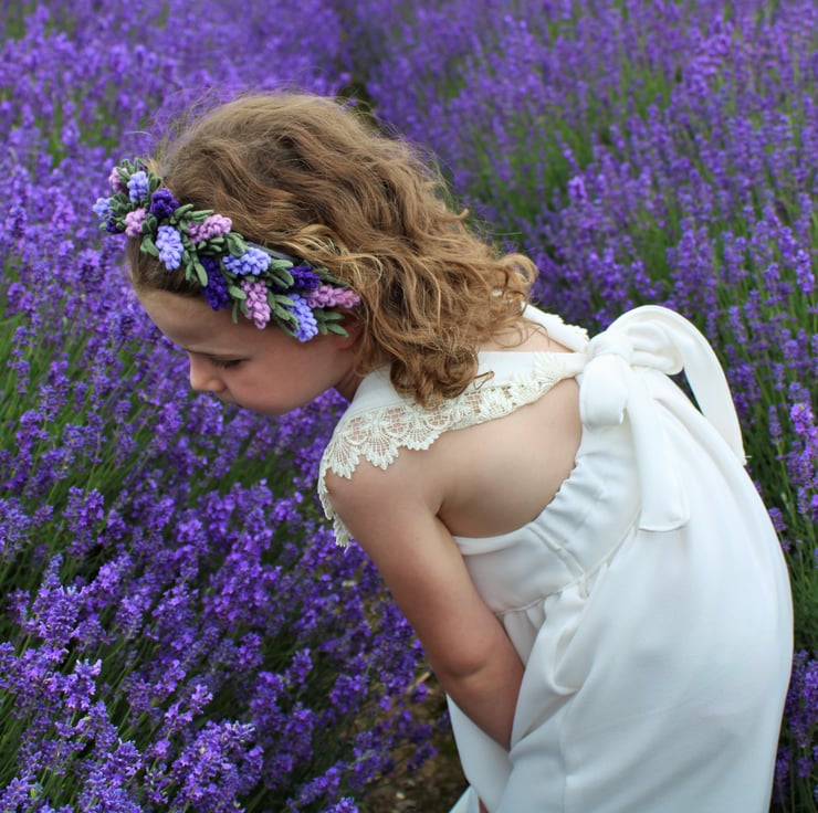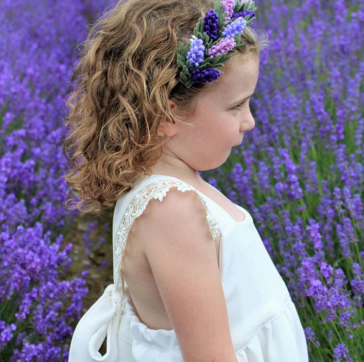Handmade felt lavender with greenery on a nylon headband or hair clip, in hues of purple. These flowers can be made in different colours, just send me a convo if you can't see what your looking for! Great for a photoshoot, Christening, Baptism, Communion, Wedding etc. These headbands will fit from newborn up to older children.