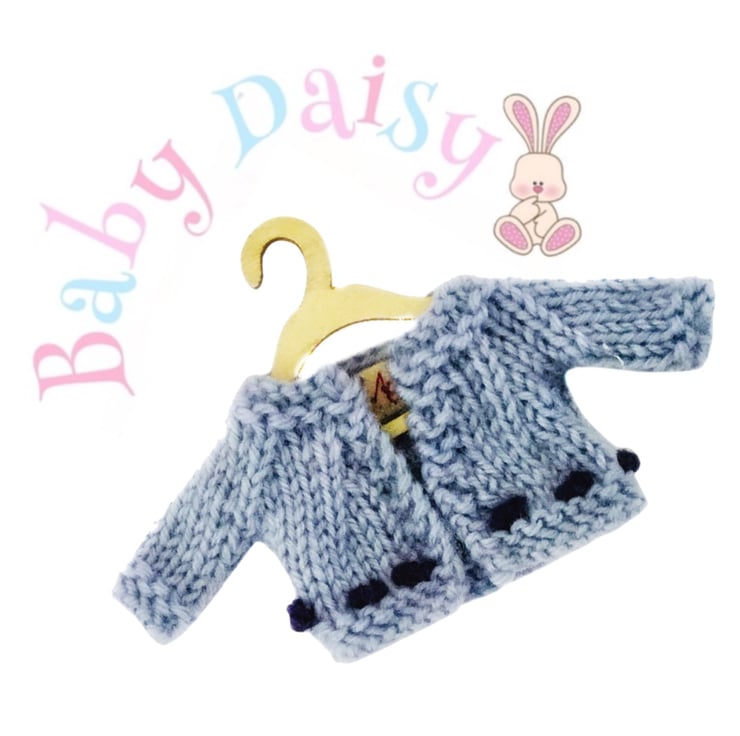 A pretty little pale blue cardigan made especially to fit baby Daisy. The cardigan is decorated with little Navy dots around the waistband and comes on a cute little wooden hanger.