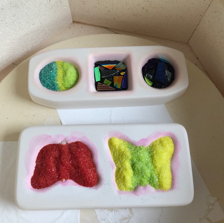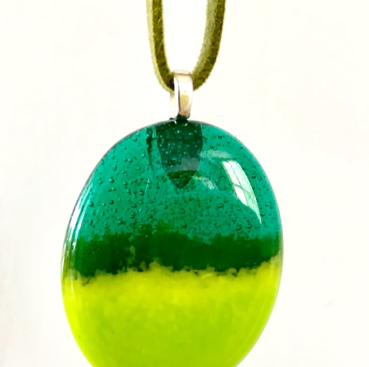 This handmade oval pendant was made by casting opalescent spring green, yellow and translucent aqua glass frit in a mould and melting in the kiln to 800 degrees Celsius. It is hung on an olive green suede cord measuring approximately 16”. An extension chain can be added at request. The pendant measures approximately 38mm by 30mm and is packaged in a necklace gift box.
