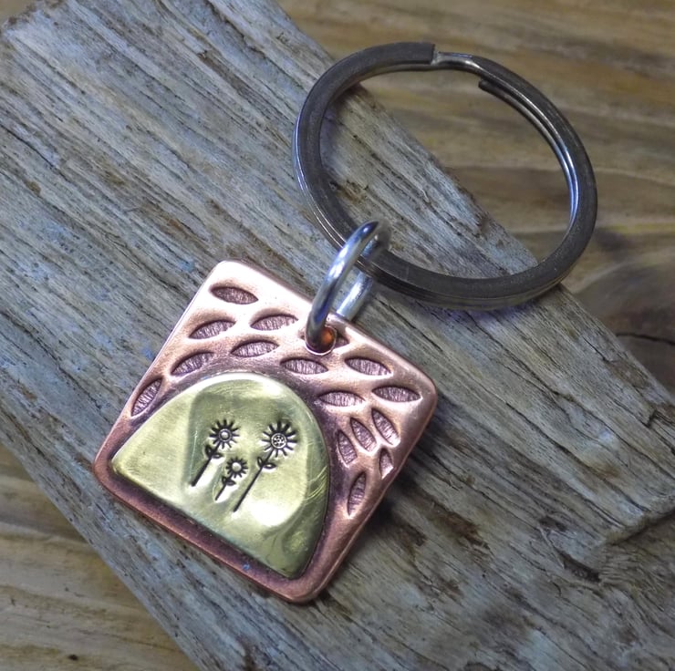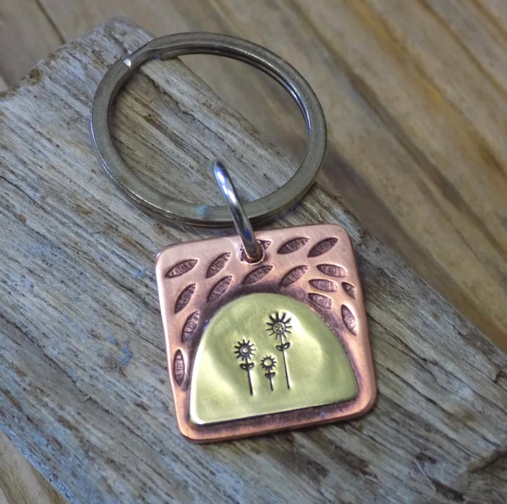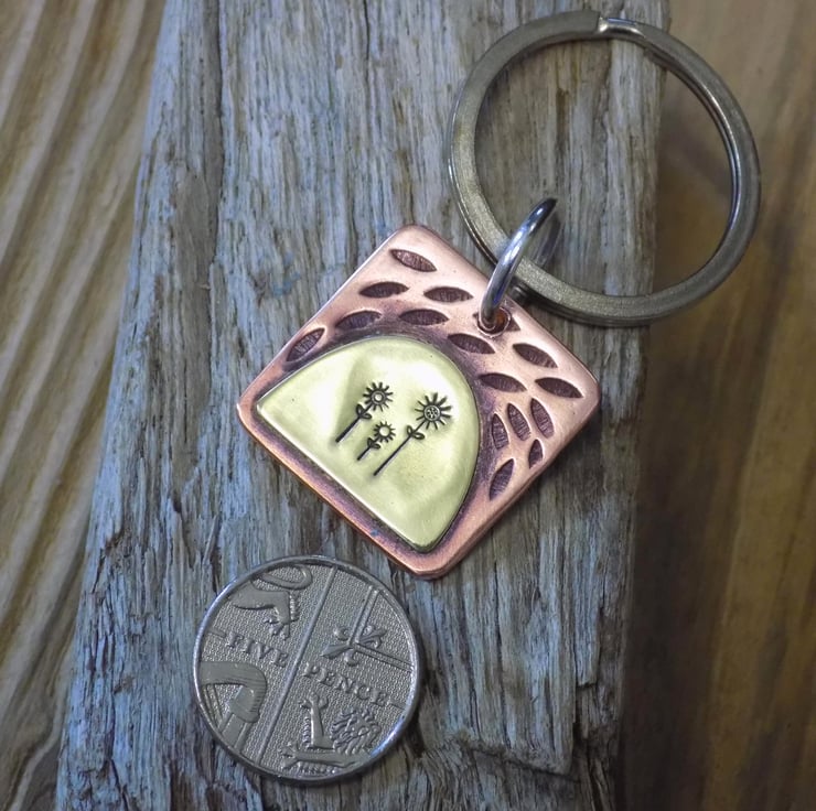 Made from 1.5 mm thick copper sheet layered with brass sheet. The brass has been stamped with a pretty flower design and soldered to the front of the copper. The keyring has been given an aged effect which picks out all the detail and texture creating a lovely contrast between the brass and copper, it has a very tactile whimsy feel to it.