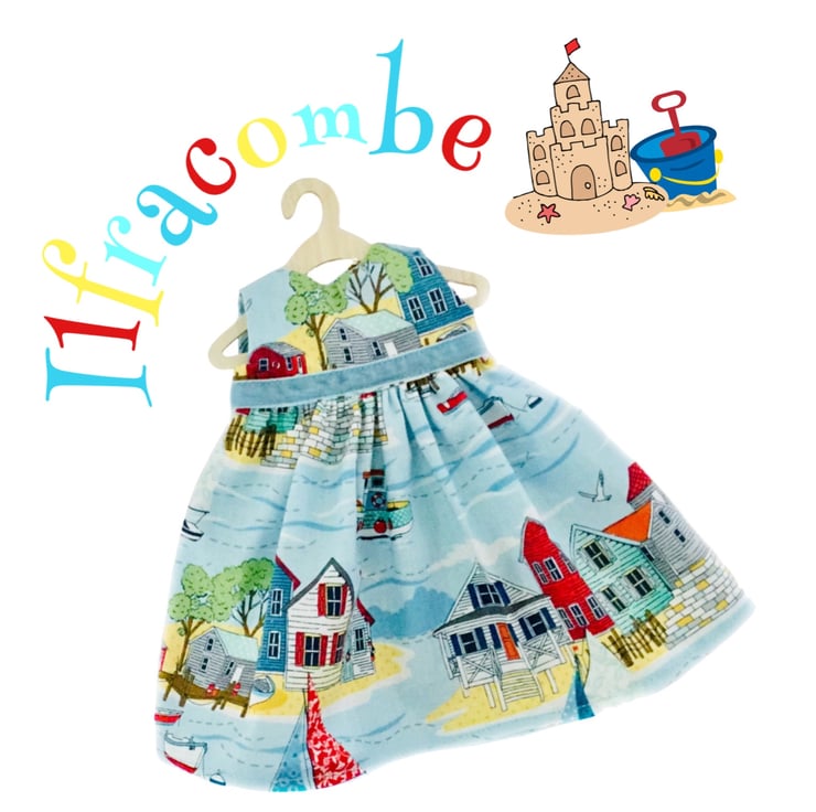 A little seaside town print dress, reminiscent of childhood holidays to fit the Mulberry Green characters. The dress is made from best quality cotton, has a full skirt, a lined bodice and comes on a cute little wooden hanger.