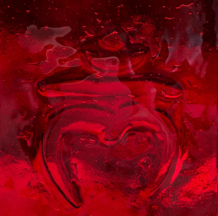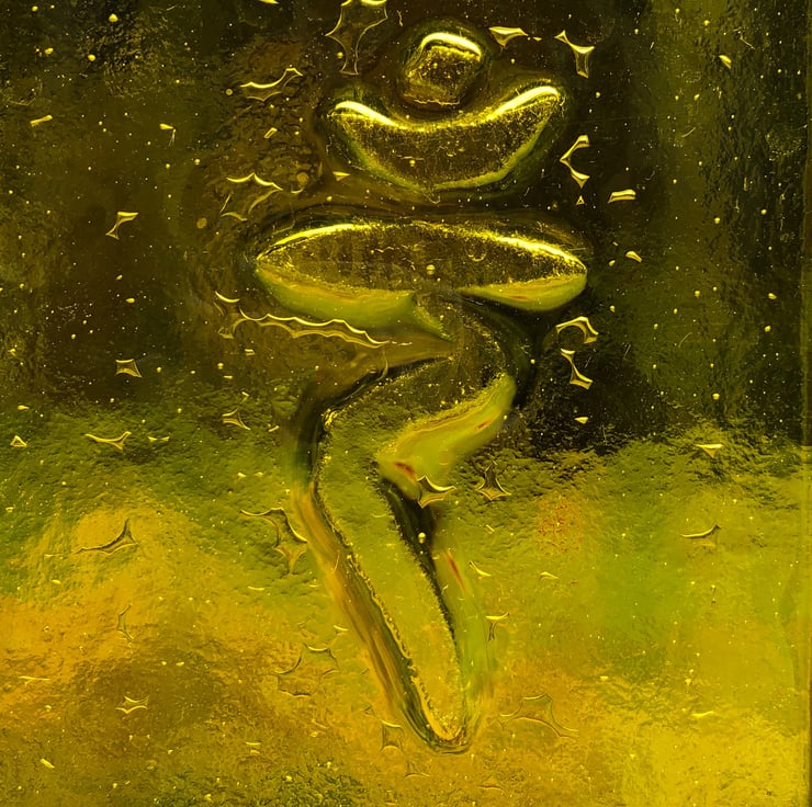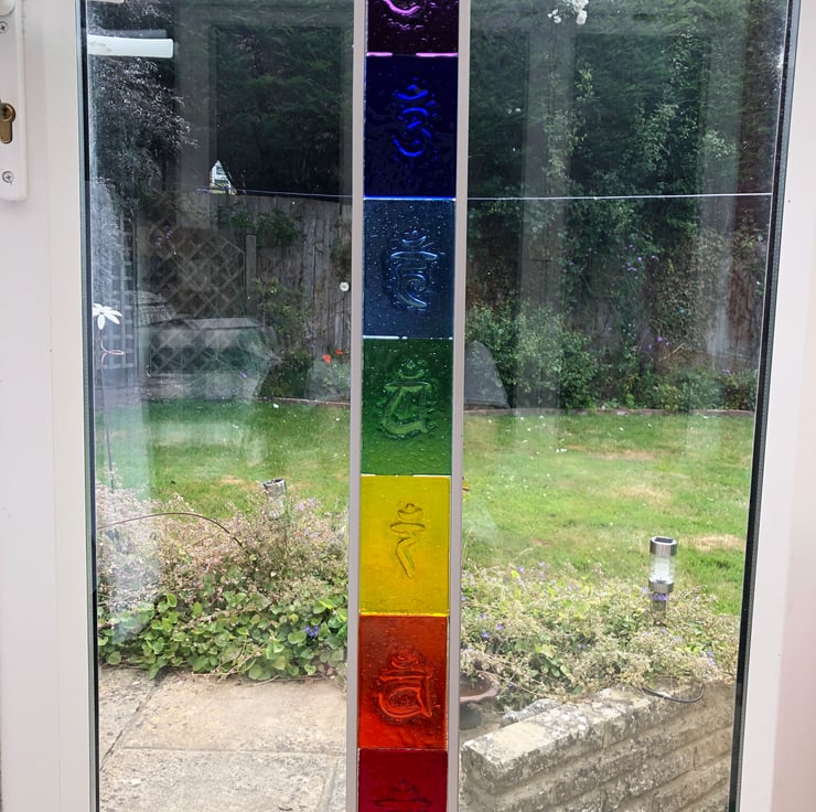 An elegant slim garden sculpture panel with a chakra design. The aluminium frame encasing the glass measures 1200 x 100mm, with the glass 750 x 80mm, it was made from 3 panels of clear with the rainbow colours fused on top and fired over the symbols to create an embossed pattern. Perfect for a quiet spot in the garden where the sun shines through it or with a spotlight behind for lighting at night.
