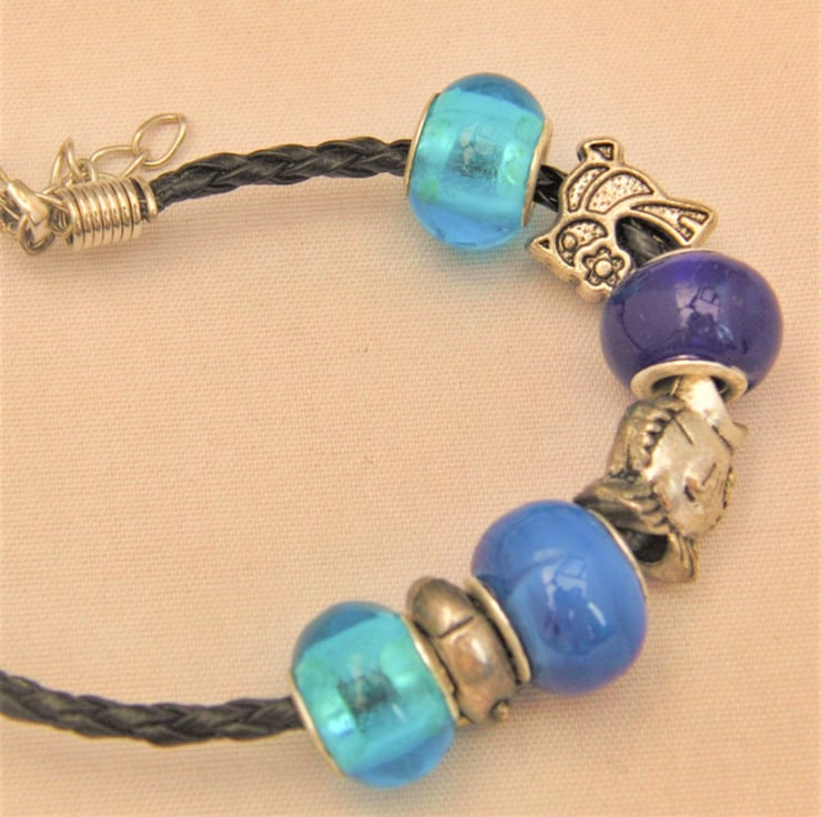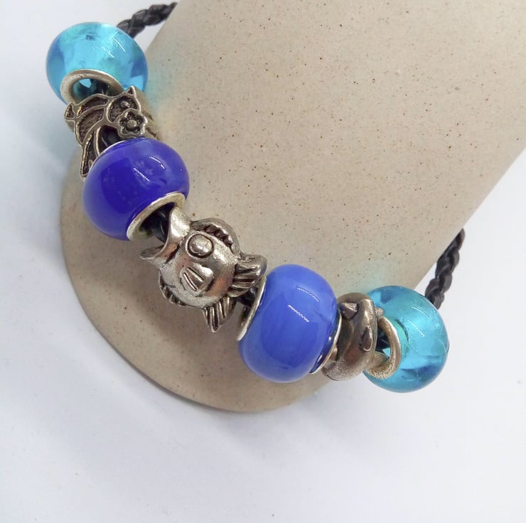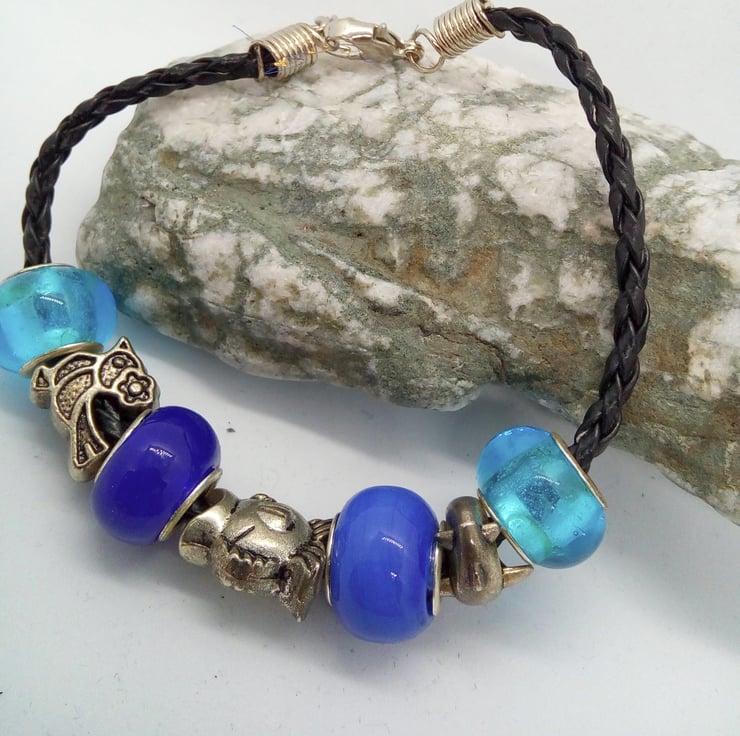 Blue European Lampwork Beaded Bracelet with Silver Plated Charms, Black Plaited Leather Band, Jewellery, Gift, Birthday, Christmas, Casual