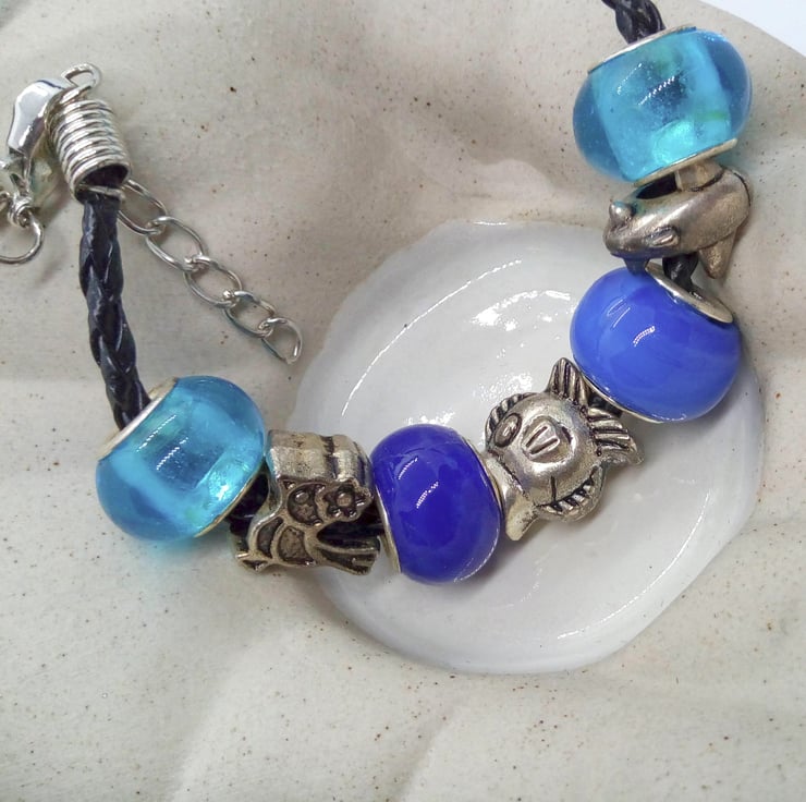 The bracelet is made using 12 mm Lampwork Glass Beads in clear blue, cobalt blue, royal blue and clear blue, the silver plated charms are a bird, a fish and an aeroplane, on a black plated leather Bracelet. Bracelet is 19.5 cm in circumference and has a silver plated lobster clasp.