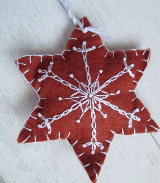 When making anything with snowflakes on I try to ensure that each one is different, so this gingerbread biscuit style decoration has been carefully hand embroidered with a one-off design. Lightly stuffed and finished with white blanket stitch and a twisted thread hanger, this would look lovely either on the tree or as a parcel decoration.