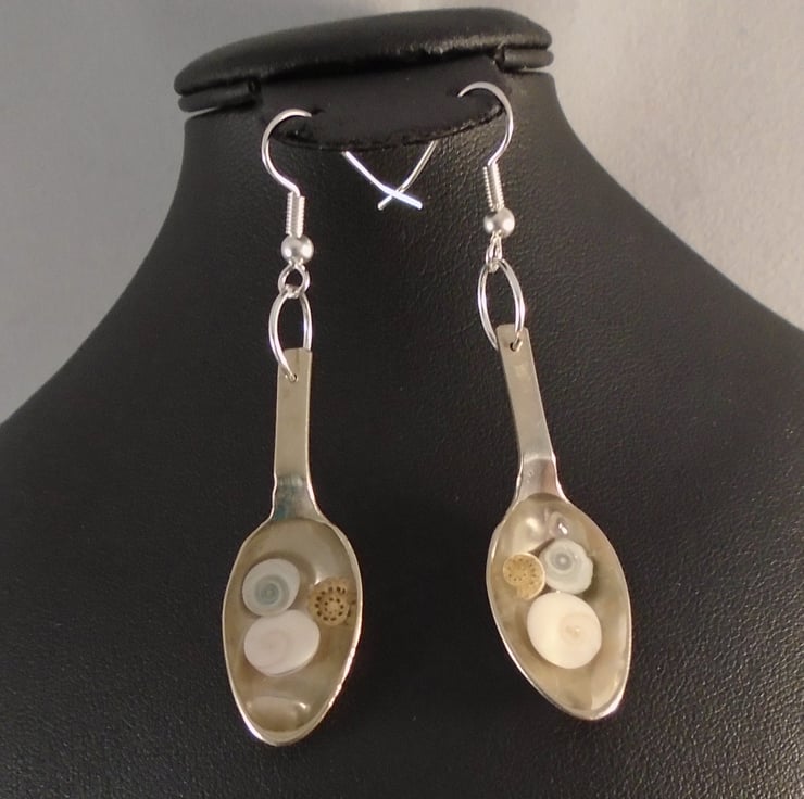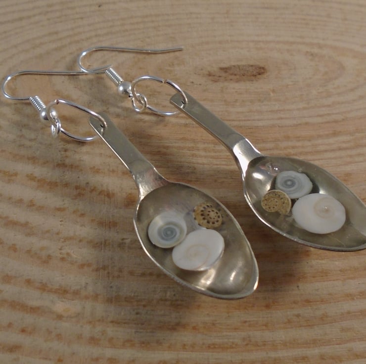 A quirky and unusual pair of earrings, hand made from an old pair of silver plated sugar tongs. The bowls of the spoon have been sawn off and a hole drilled in the top so they can be attached to silver plated ear wires. The bowl of the spoon have then been filled with small shells and covered with clear resin.