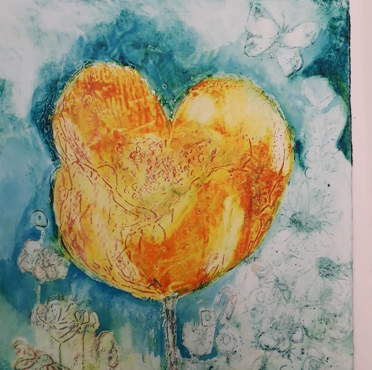 This Poppy Heart brings the delicate feeling of wild flowers and summer air together with fresh and inspiring colours. It is a collagraph and so by using collage to print make this piece of art gives you the texture and a feeling of being in a meadow. Dreamy, colourful art that floats and zings. Butterfly days and scrummy colour for your wall. I create a Poppy heart to give a kaleidescope of colour so you have an original edition which brings that summer sky feeling.