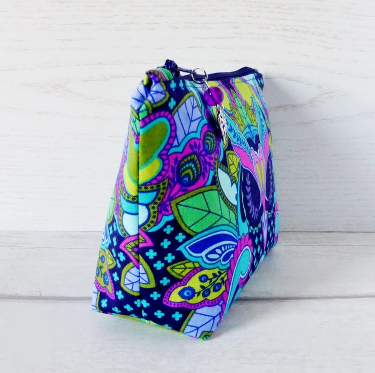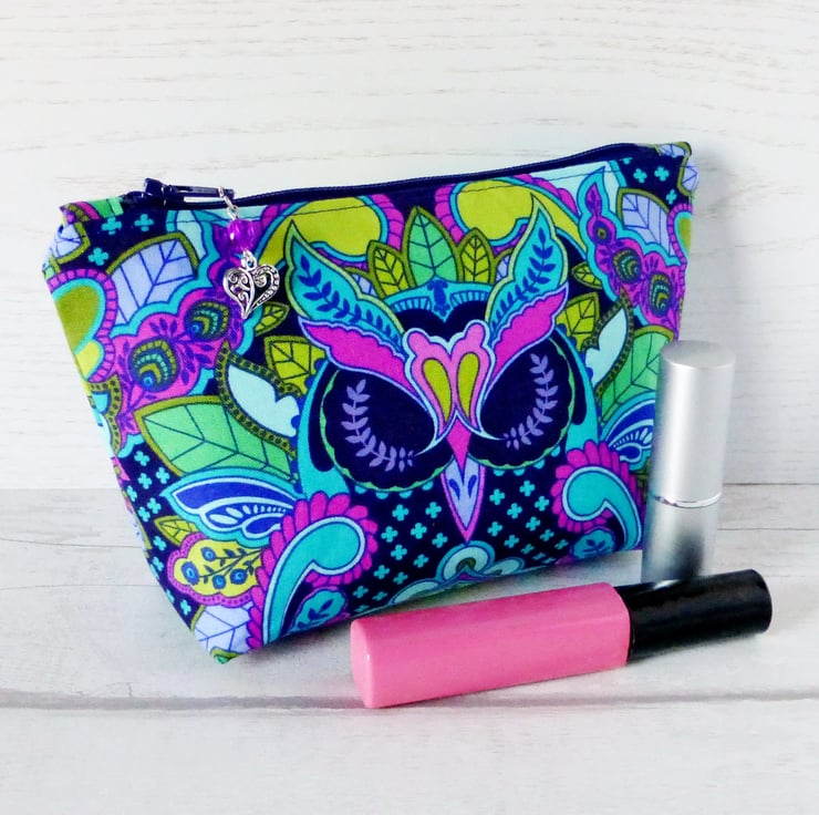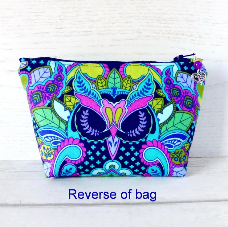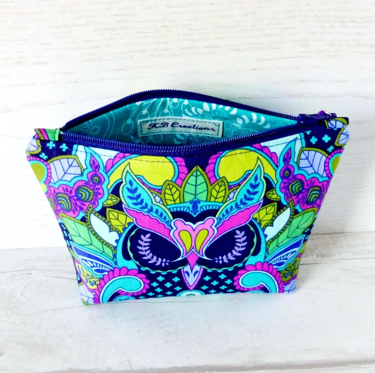 A medium sized make up bag/zipped pouch made from a cotton fabric with a striking owl design by Tula Pink. The owl design fabric is !00% cotton in shades of purple, turqoise, pink and green.. The lining is 100% cotton turquoise and white design by Alison Glass.