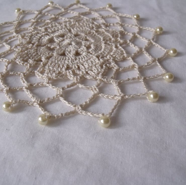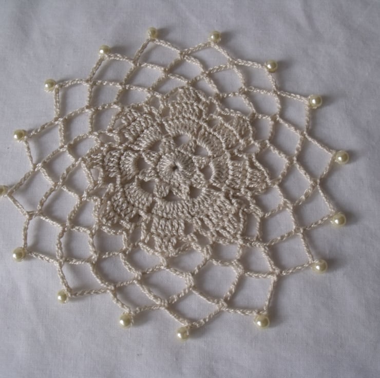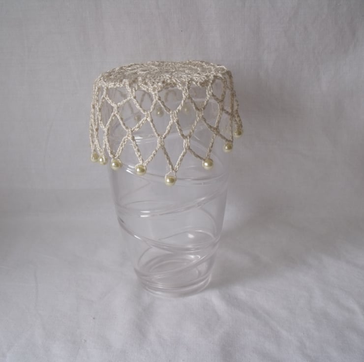 A useful crocheted beaded doily to keep those bugs out of your drink whilst drinking outdoors.