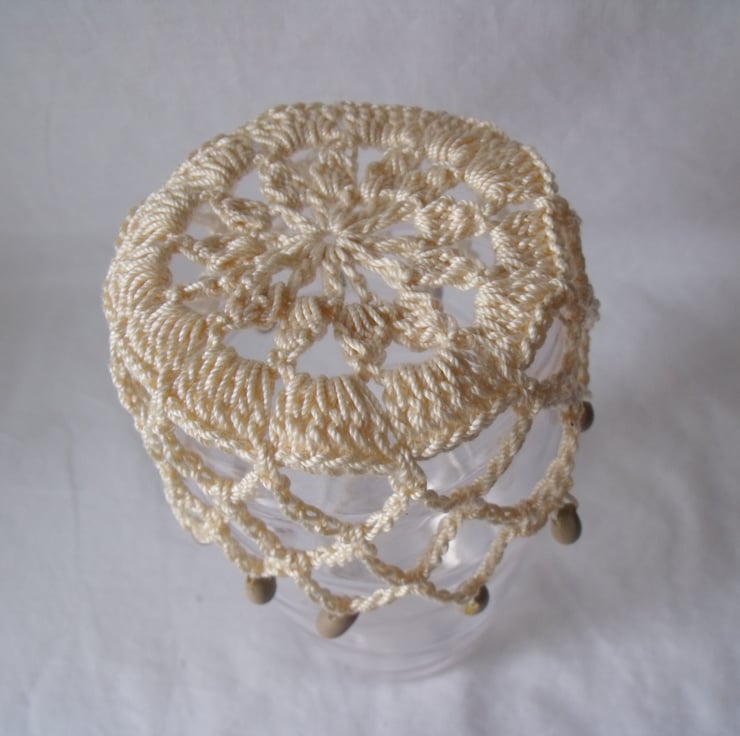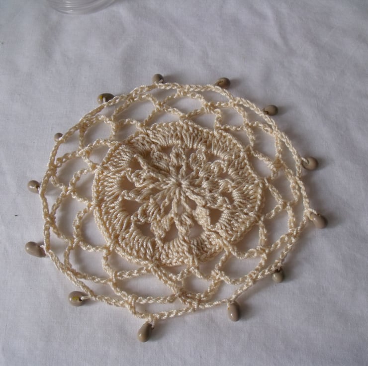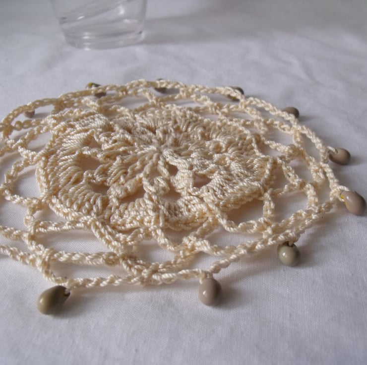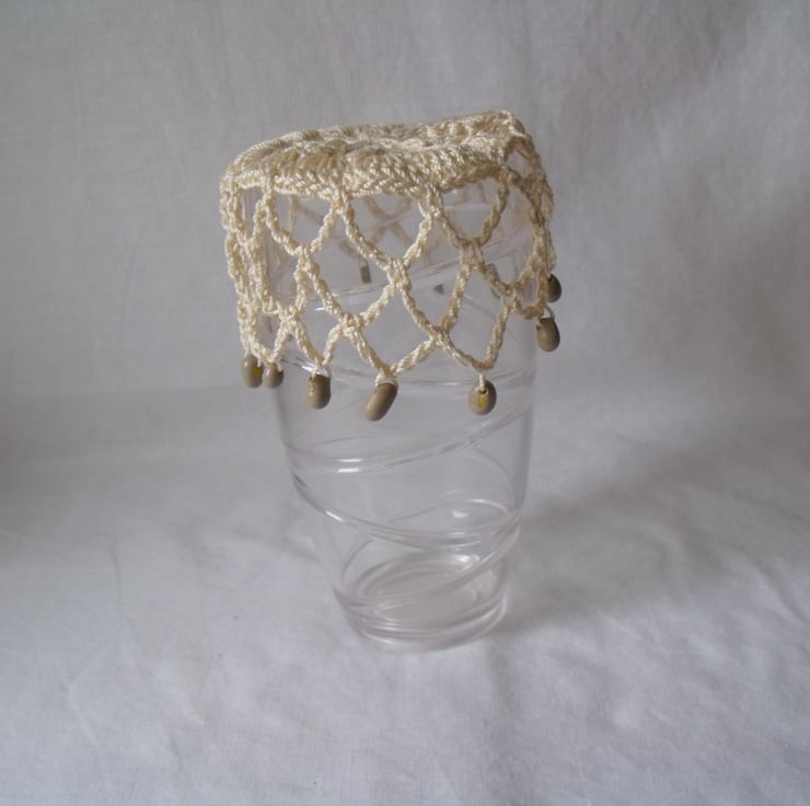 A useful crocheted beaded doily to keep those bugs out of your drink whilst drinking outdoors.