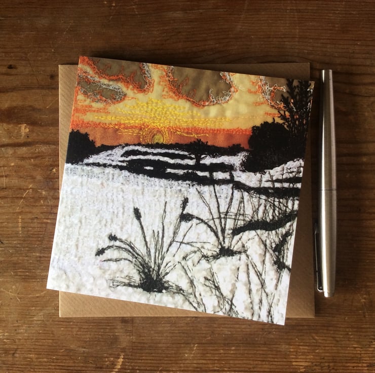 This card is a print of one of my free motion embroiderd landscapes of Yorkshire. It shows a spectacular sunset over a snowy West Yorkshire scene, with grass breaking through and a deep brown silhouette of Yorkshire hills. The card measures 14.5 x 14.5cm and it comes with a brown envelop in a plastic cover for protection.