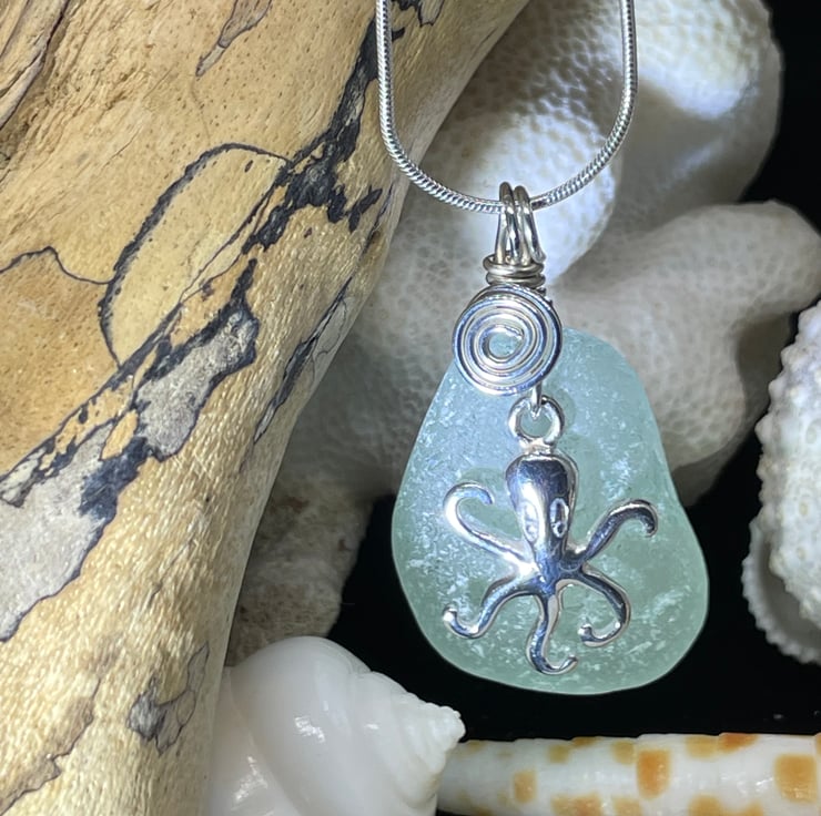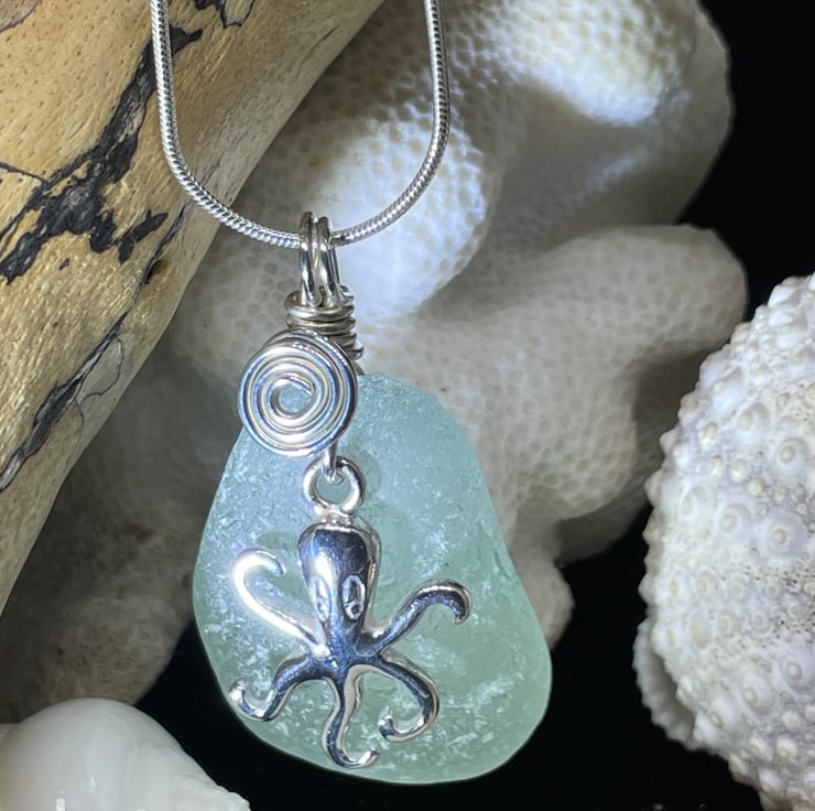 Handcrafted, genuine Sea Glass & Sterling Silver Necklace/Pendant. This item features a Sterling Silver Octopus charm and comes complete with a 16" Sterling Silver snake chain.