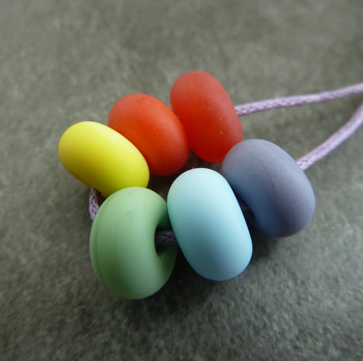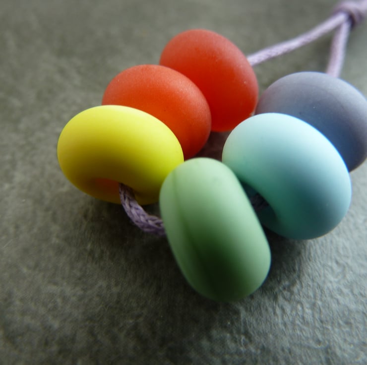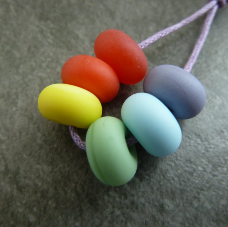A set of 6 lampwork glass beads made with red, orange, yellow, green, blue and purple glass. They have been tumbled to give a smooth finish.