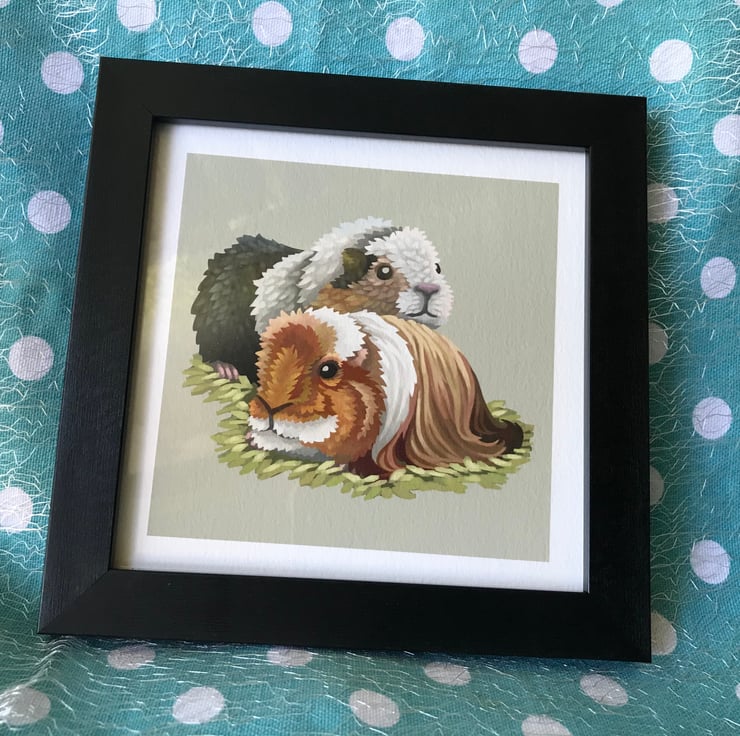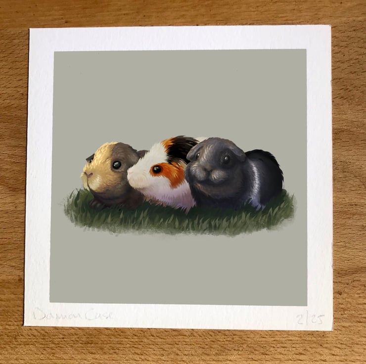 Be one of a select few to own one of these cute 'Guinea Pigs' limited edition prints. Printed on 6" by 6" German etching paper with a 1” white border. Printed to order so can take up to 14 days to arrive. Print is numbered and signed by DuffleCat Prints artist Damian Case. Print is unframed.