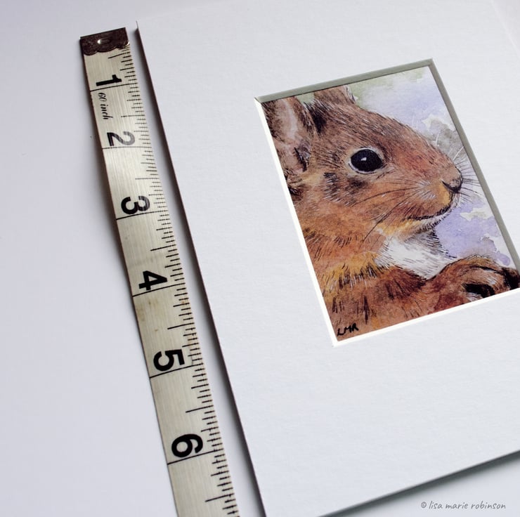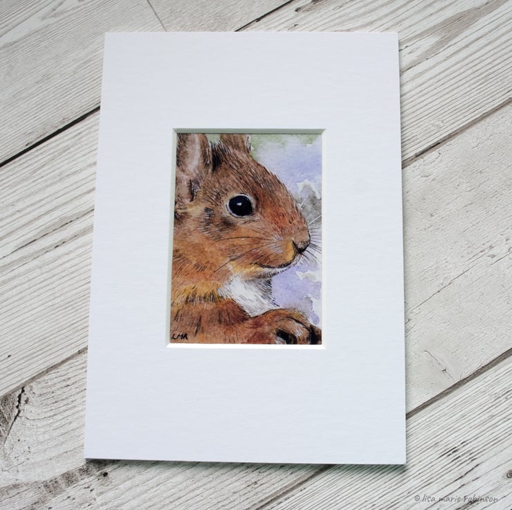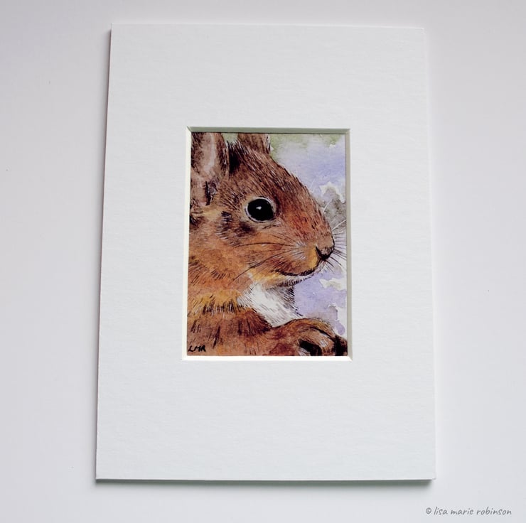 An open edition print of my ACEO painting of a red squirrel. Miniature art for small spaces!