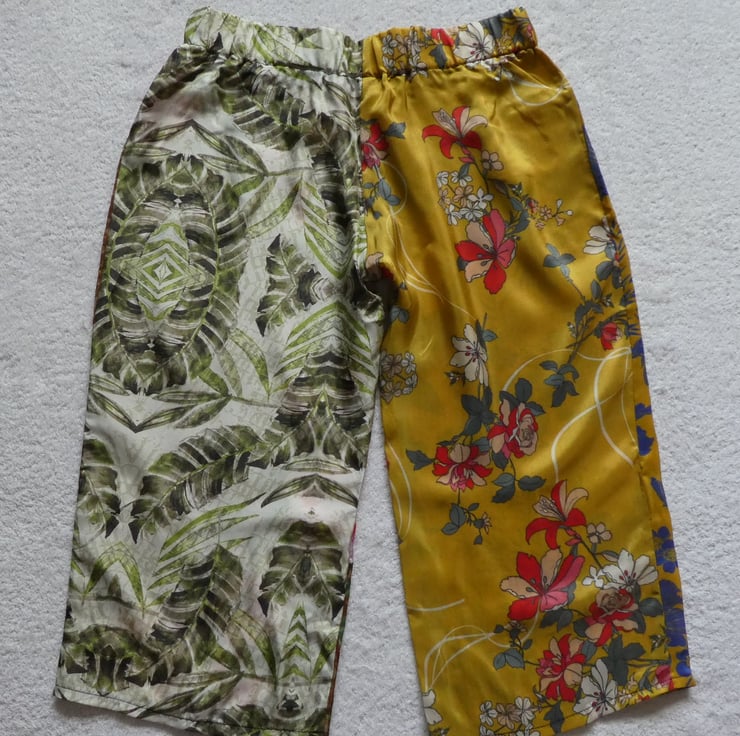There are 4 different print patterned silk panels used, one for each part of the leg, to make a unique and funky garment. All seams have been professionally finished with an over-locker. The waistband is elasticated for a comfy fit.