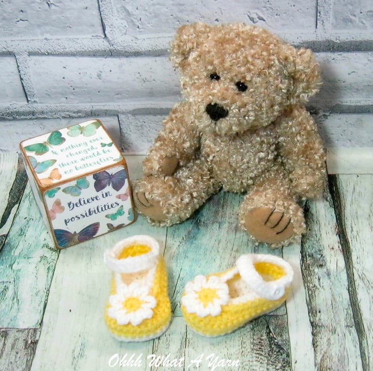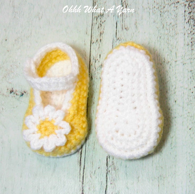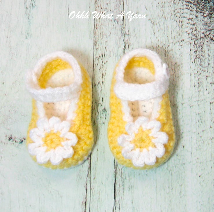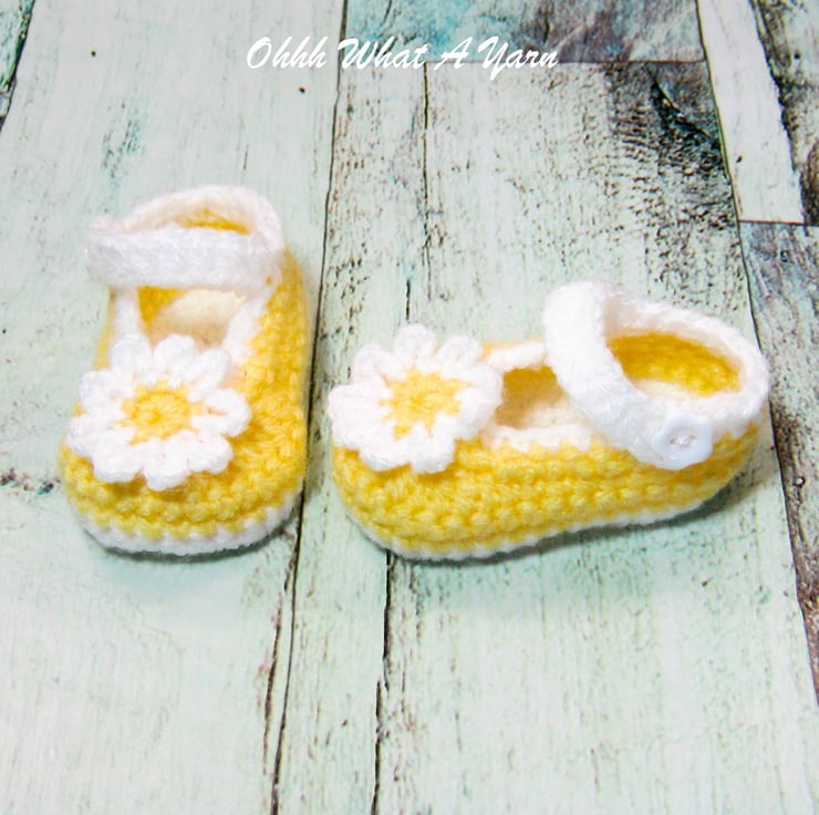These gorgeous yellow and white crochet shoes are crocheted in 100% acrylic yarns. They have a pretty flower button to fasten the little strap and a crocheted daisy flower for decoration on the front of the shoe.