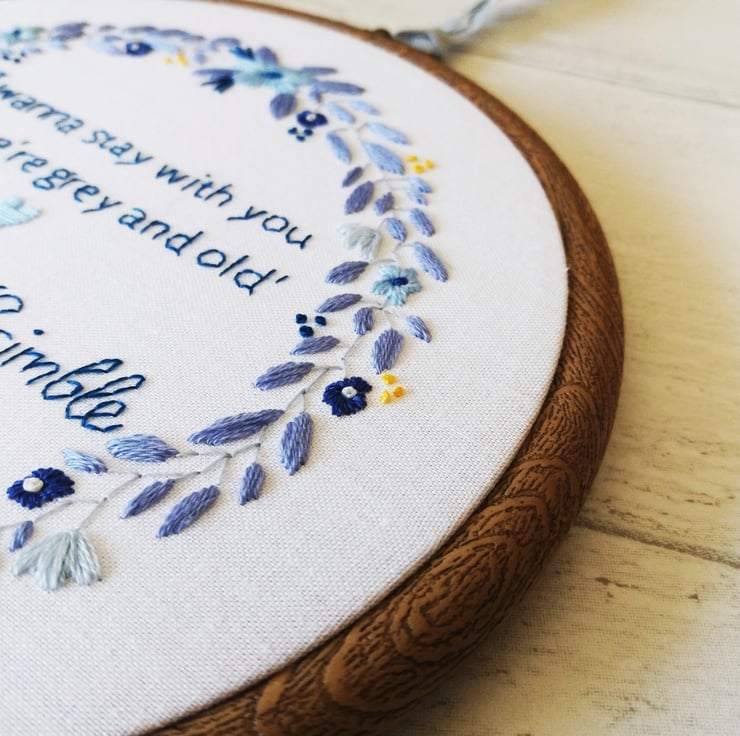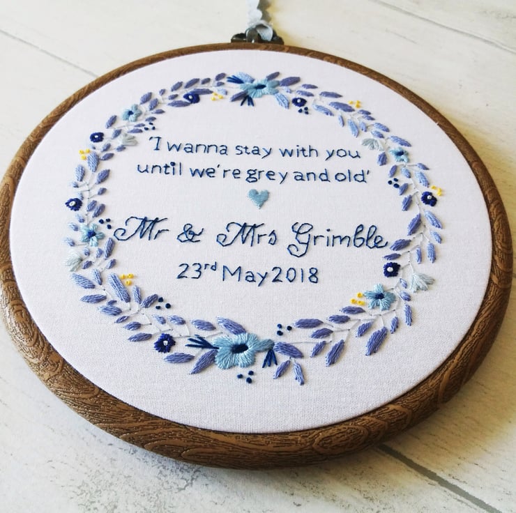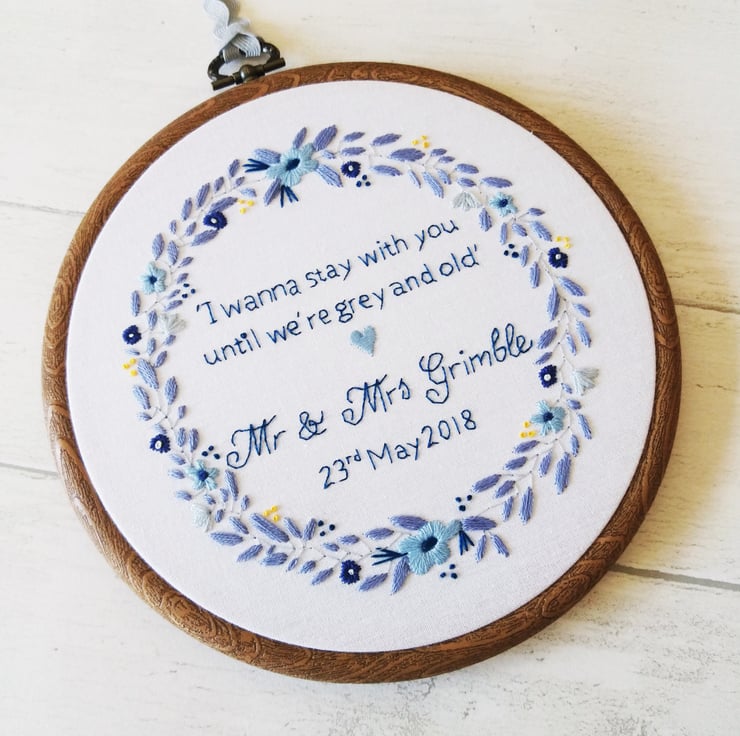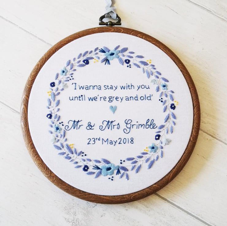 It features my original design; a gorgeous floral wreath entirely hand stitched to order. I can personalise this hoop with any colour scheme and personalisation of your choosing e.g. quote, names, lyrics, date etc.