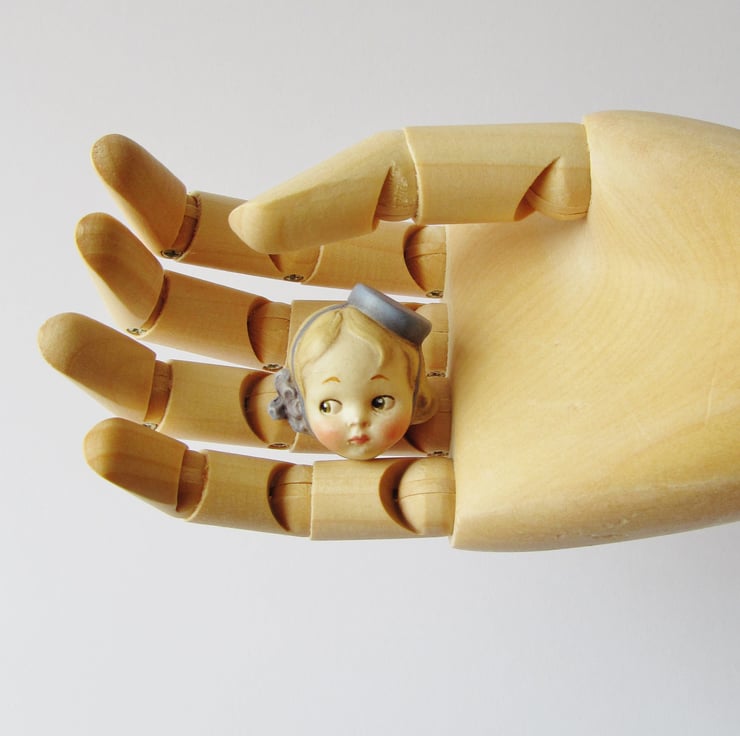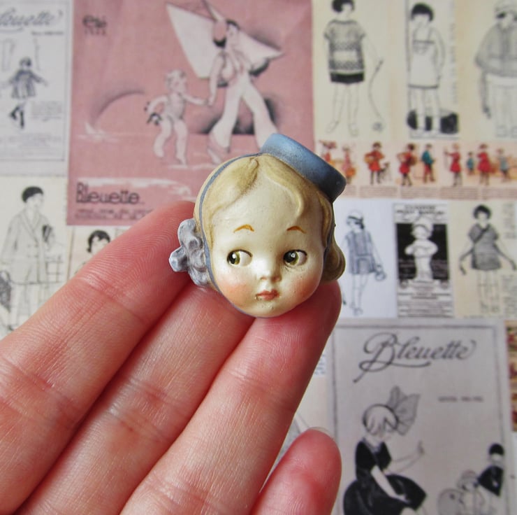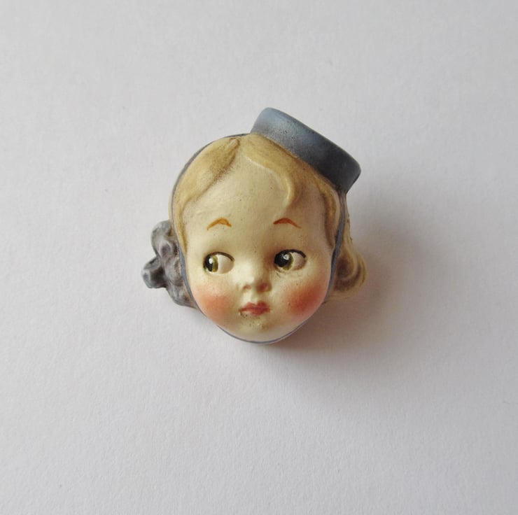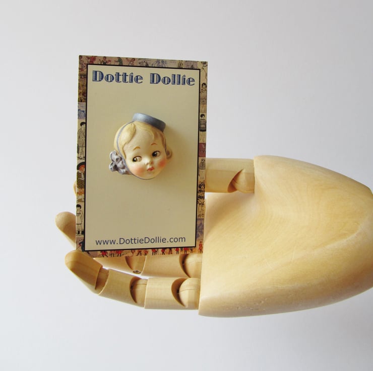 Dottie Dollie Doll Face Brooch - Bell Girl Judy is a handmade replica of a real broken antique doll head from my collection. The original head is dirty and unloved, having been discarded and buried as rubbish almost a hundred years ago.