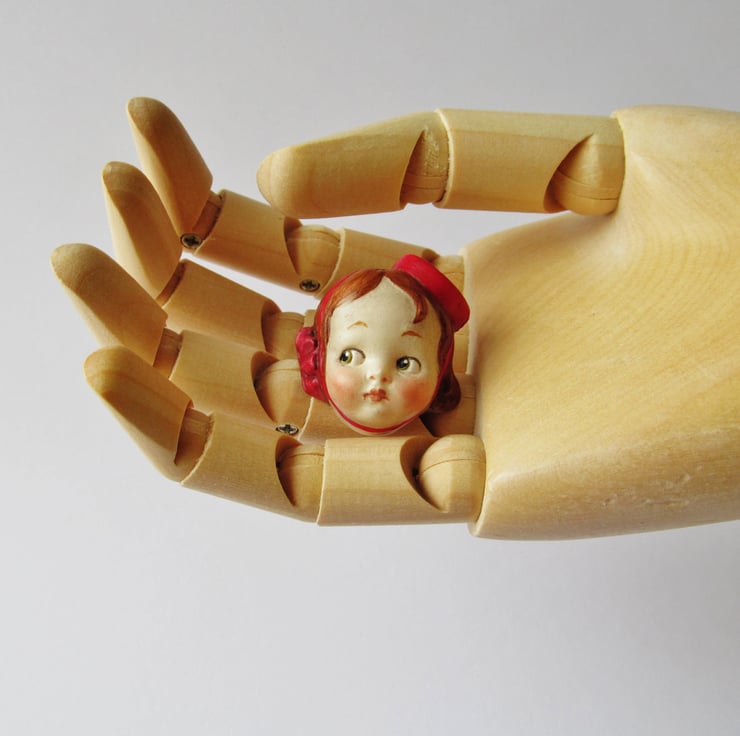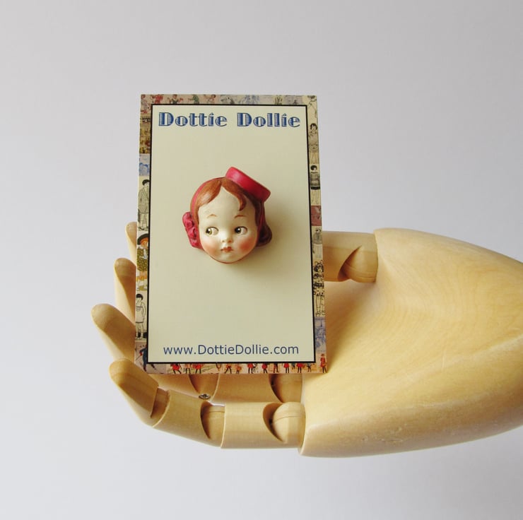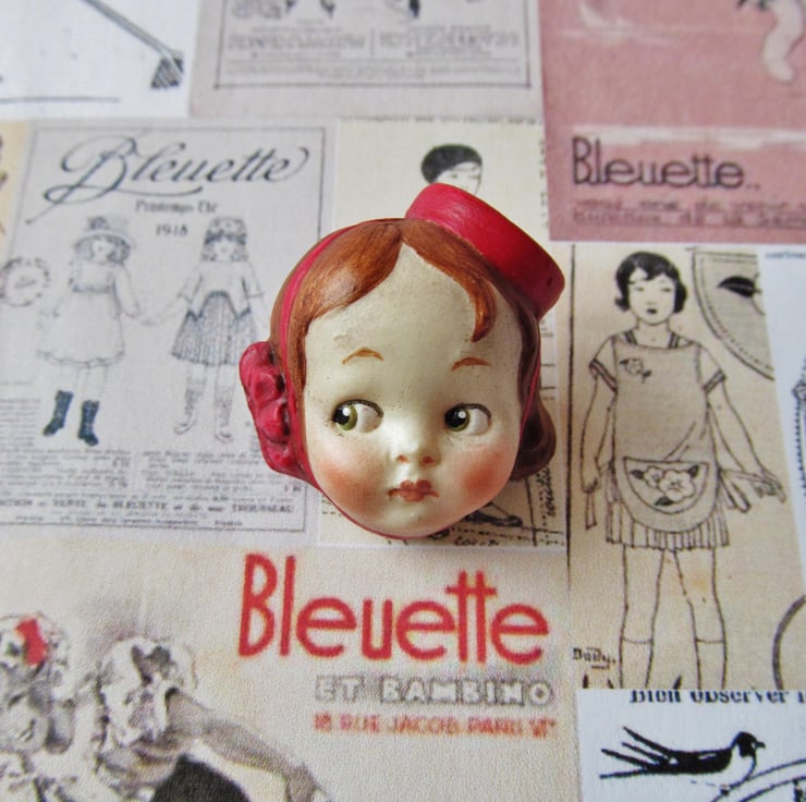 Handmade Doll Face Brooch - Bell Girl Judy is a handmade replica of a real broken antique doll head from my collection. The original head was dirty and unloved, having been discarded and buried as rubbish almost a hundred years ago. She was so cute, and cheeky that I had to give her a new life!