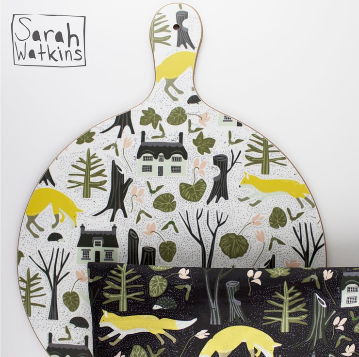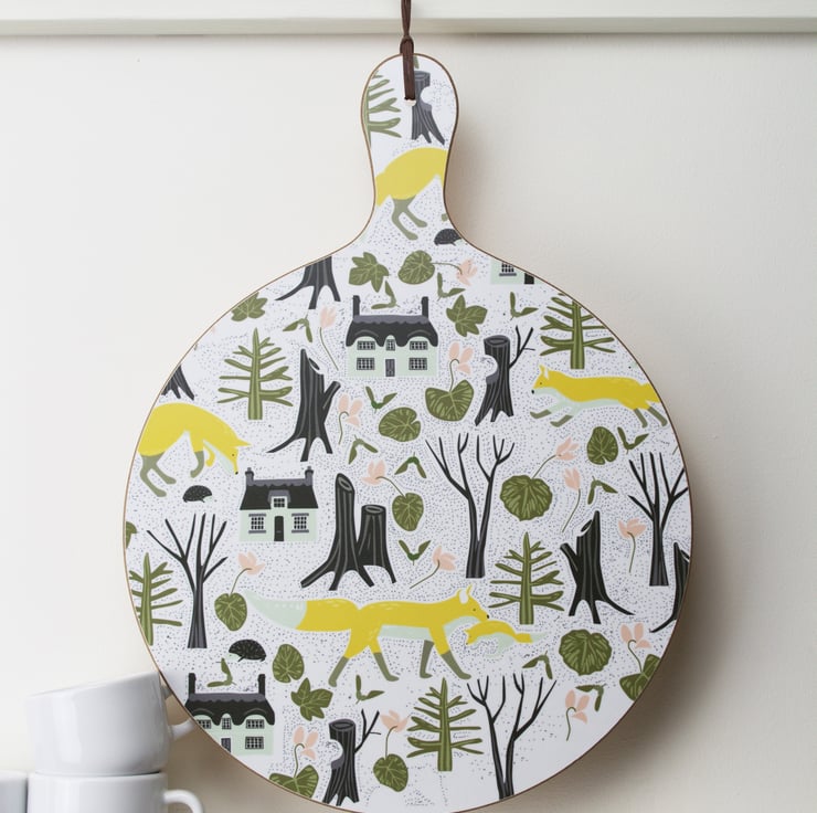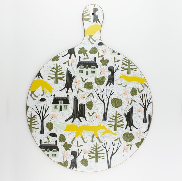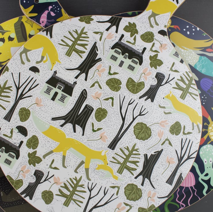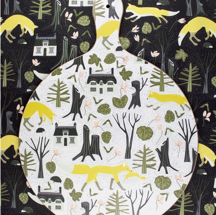 The design was inspired by our many walks around the pretty Yorkshire Dales. Our imagination has gone wild with our pictures of playful foxes and hedgehogs amongst the trees and cottages within the woodland glade.