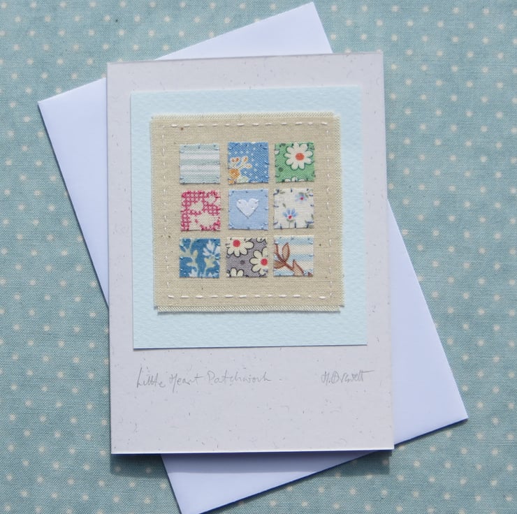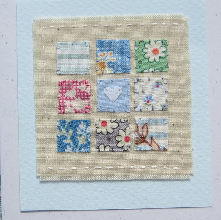 Pretty hand-stitched miniature 'patchwork' applique mounted onto greeting card. The pretty cotton fabrics are chosen with care and the centre square has a tiny white heart stitched onto it. Very fine and delicate, perfect for many different occasions. My hand stitched cards are gifts in themselves to keep, as well as a card in which to write your message.