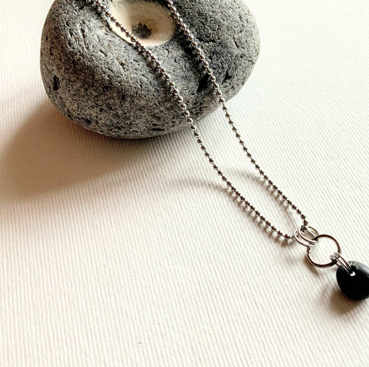 Perfectly smooth, tiny raven black beach pebble has been hand-drilled and made to be hung from a 17" stainless steel ball chain.