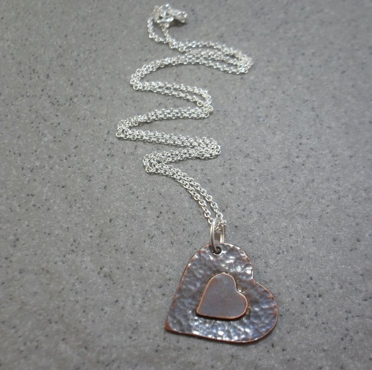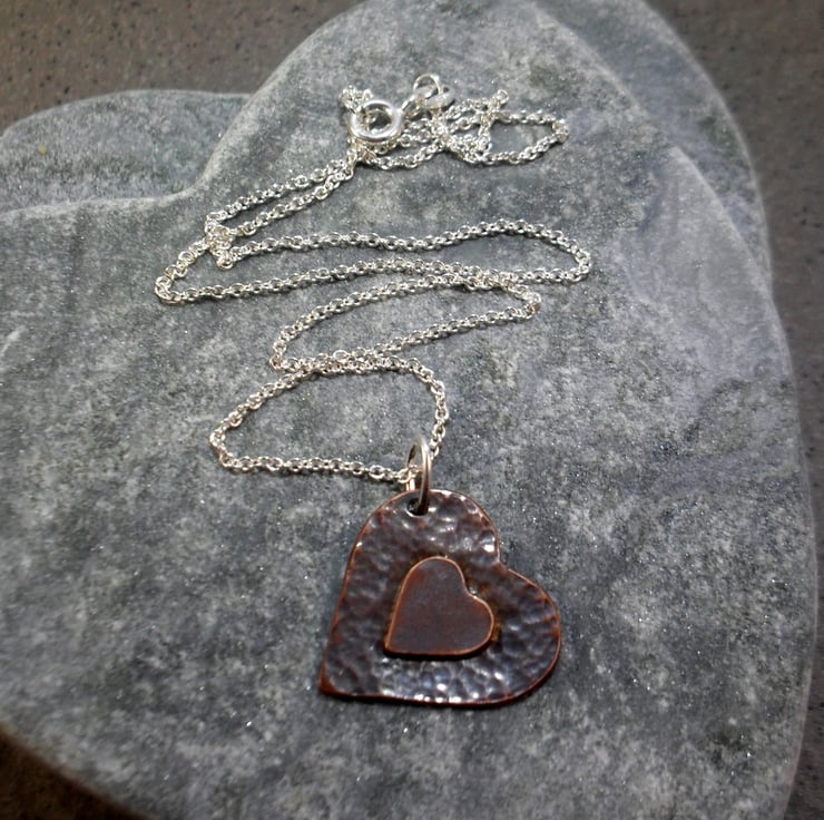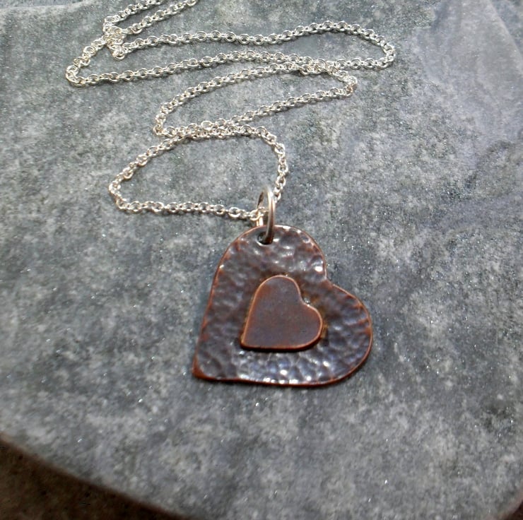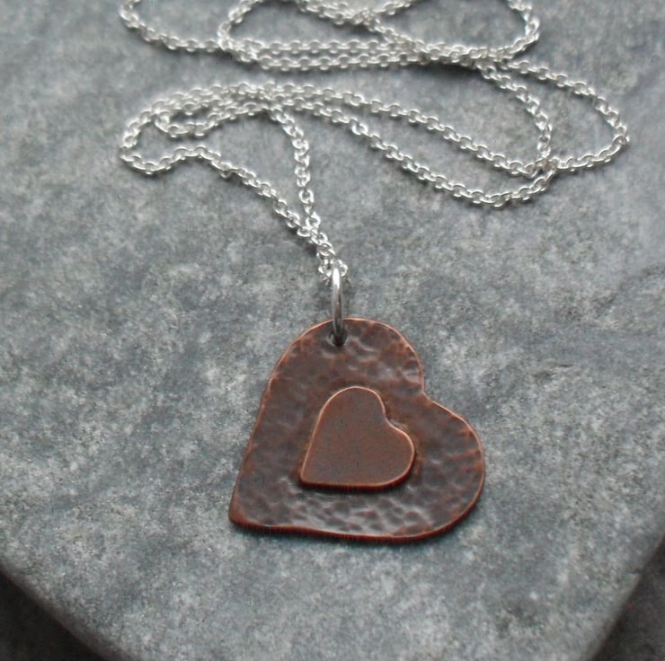 Copper heart pendant which has been cut from a sheet of copper then the pendant has been ,sanded, hammered to give texture,a smaller heart has been soldered on the top and oxidised to give an aged look. the copper then has had a coat of lacquer to help protect the petina