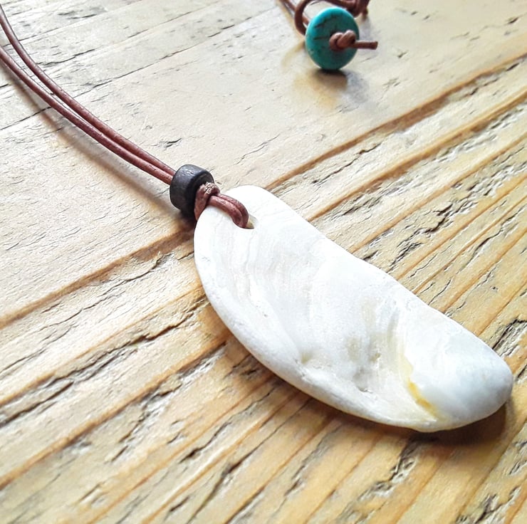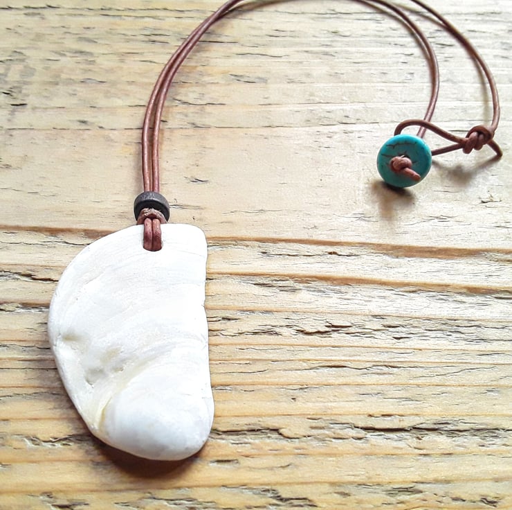 A smooth sea-worn oyster shell segment (5cm x 2.5cm), hand-drilled and hangs from an 18" tan leather cord with a dark brown bead. It fastens with a simple turquoise button and loop fastening.