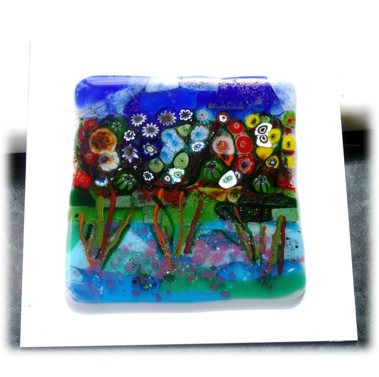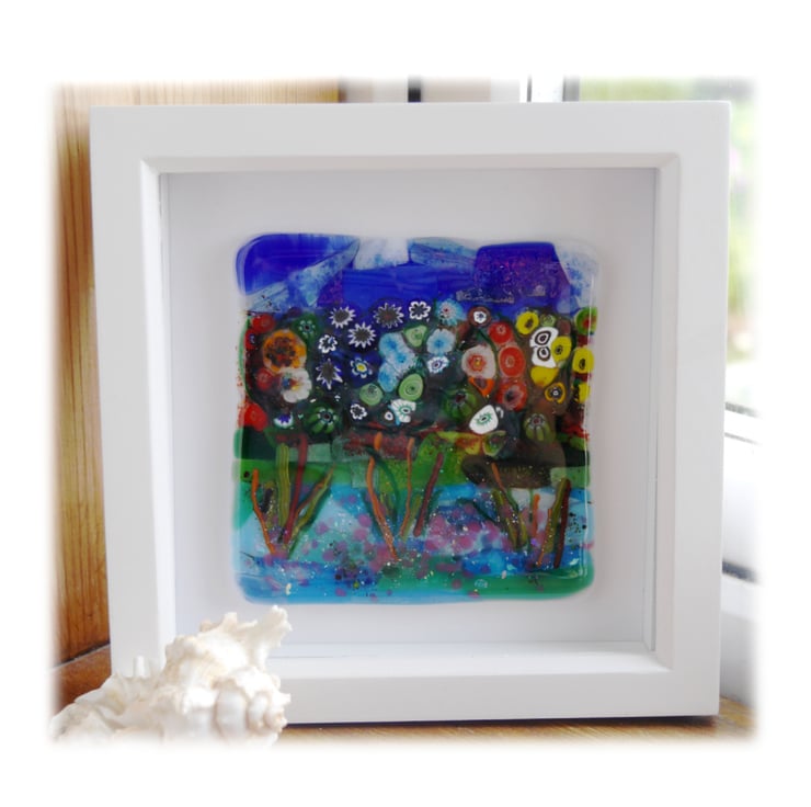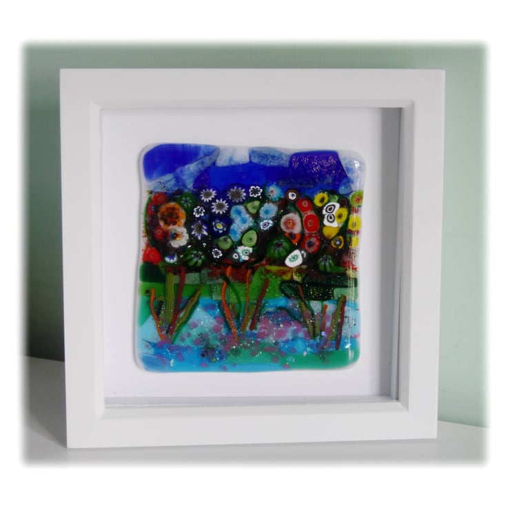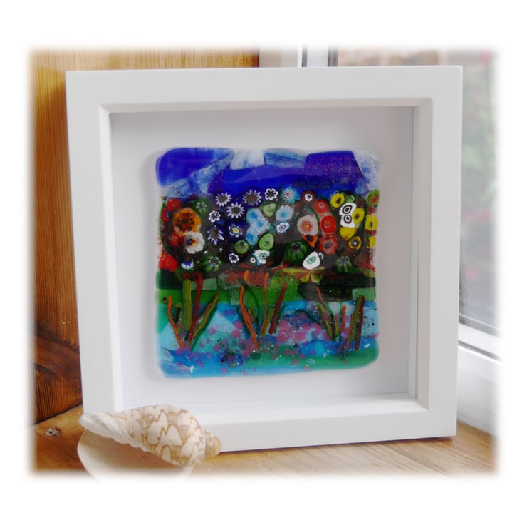 The fused flower picture measures 11cm square and is fitted at the back of a box frame with a 13.5 aperture, 18cm square frame, 3.5cm deep.