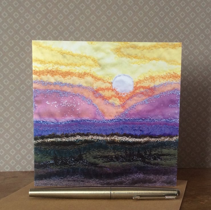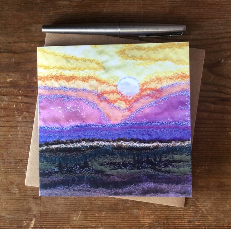This card is a print of one of my free motion embroiderd landscapes of Yorkshire. It shows a beautiful sunrise through a misty morning landscape. The card measures 14.5 x 14.5cm and it comes with a brown envelop in a plastic cover for protection.