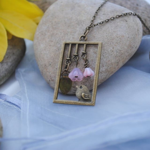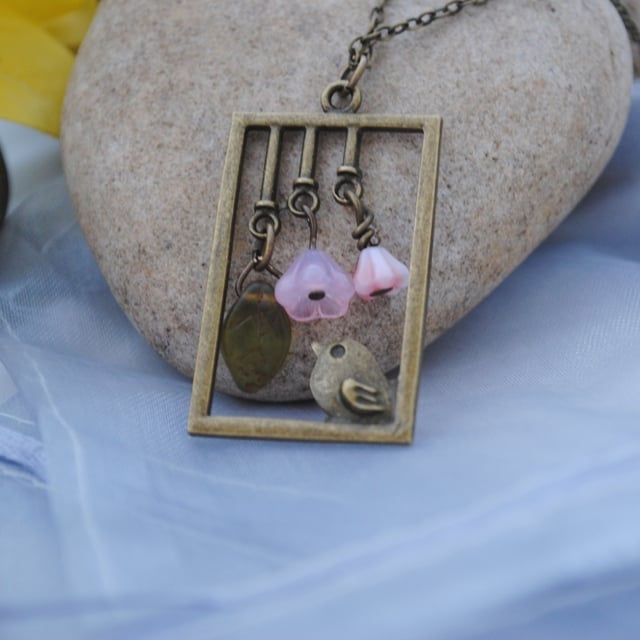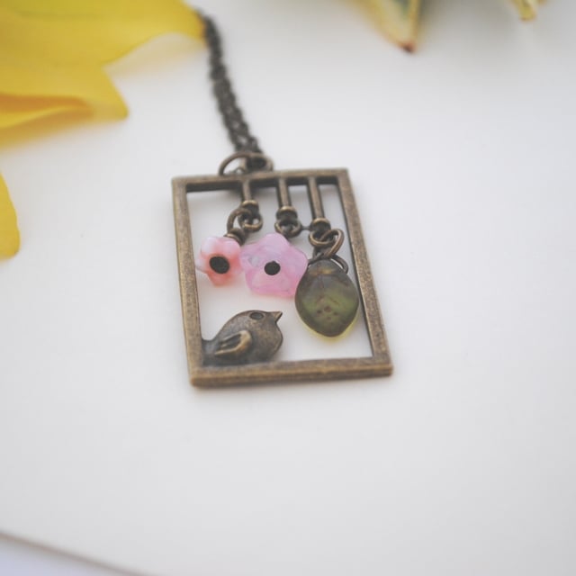Little bird necklace. This unique necklace is made with an antique brass bird on a branch complemented by pink flower charms and a green leaf bead. The necklace is made with antique brass chain finished with a matching lobster clasp.