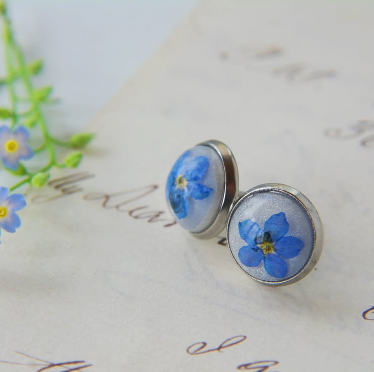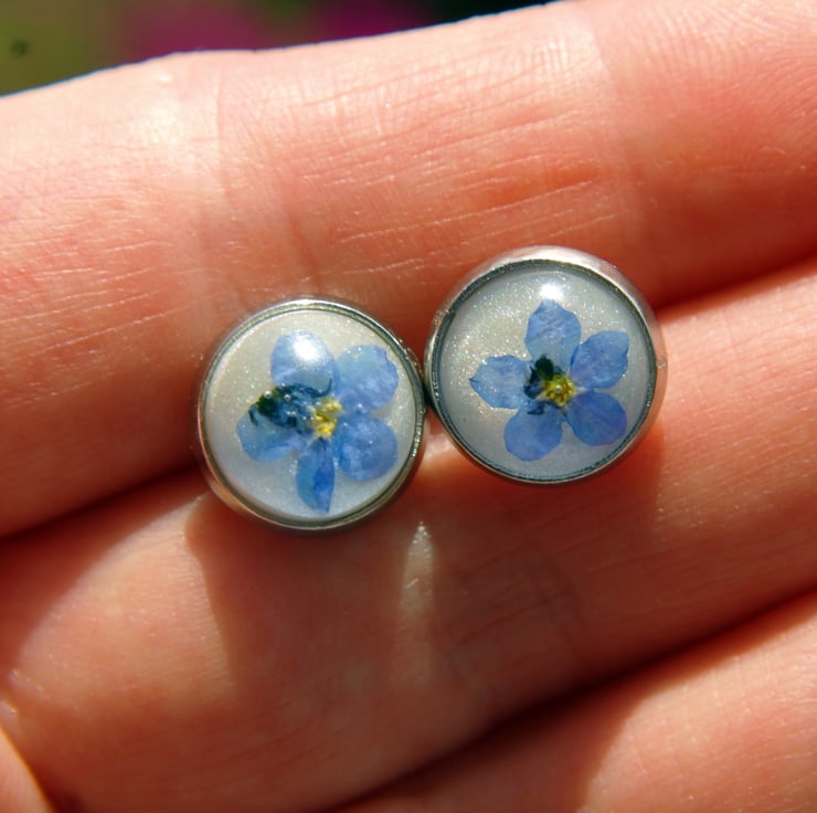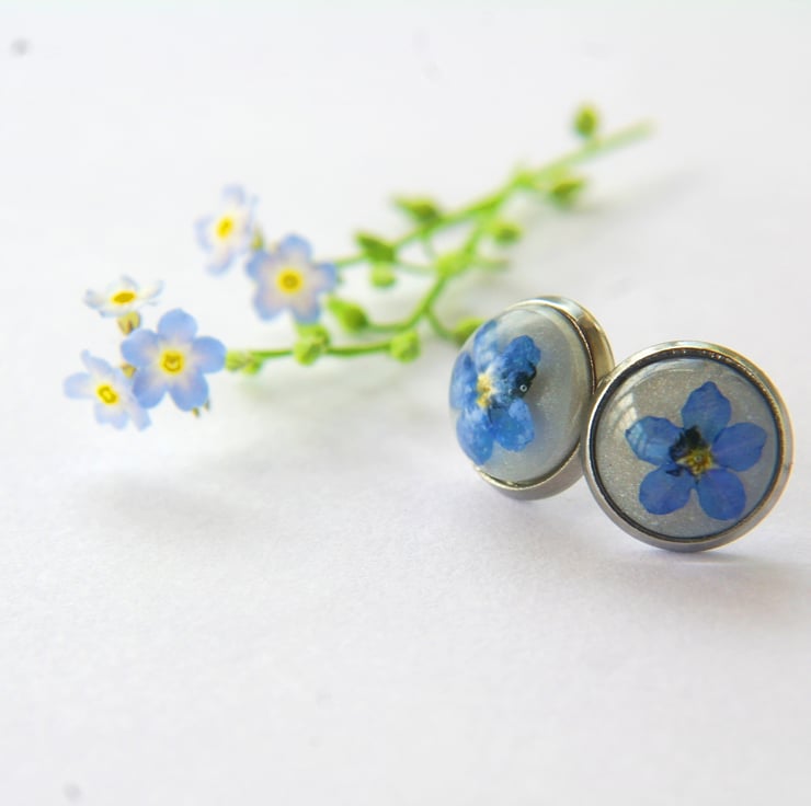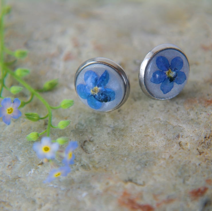 Delicate stud earrings with real forget me not flowers.