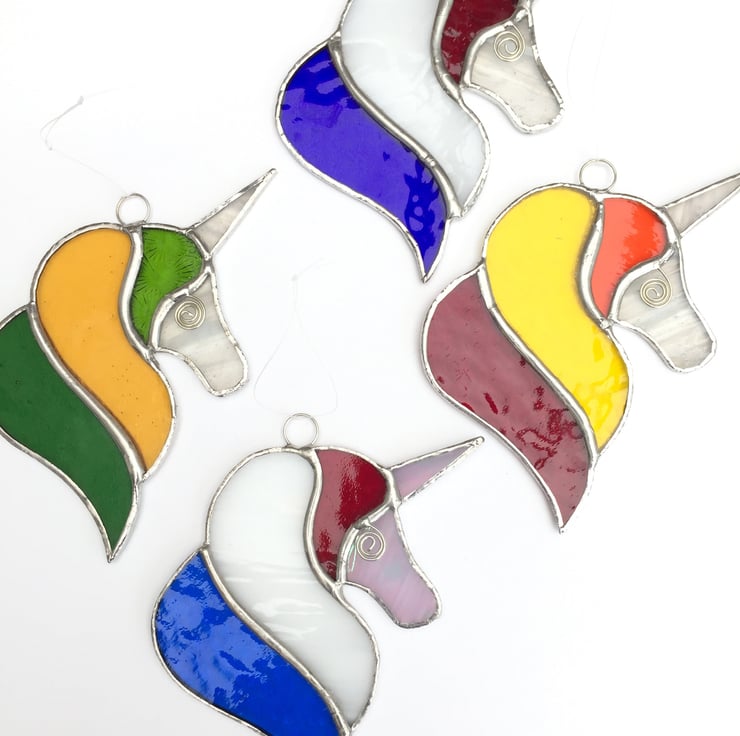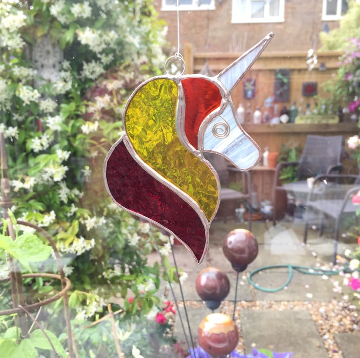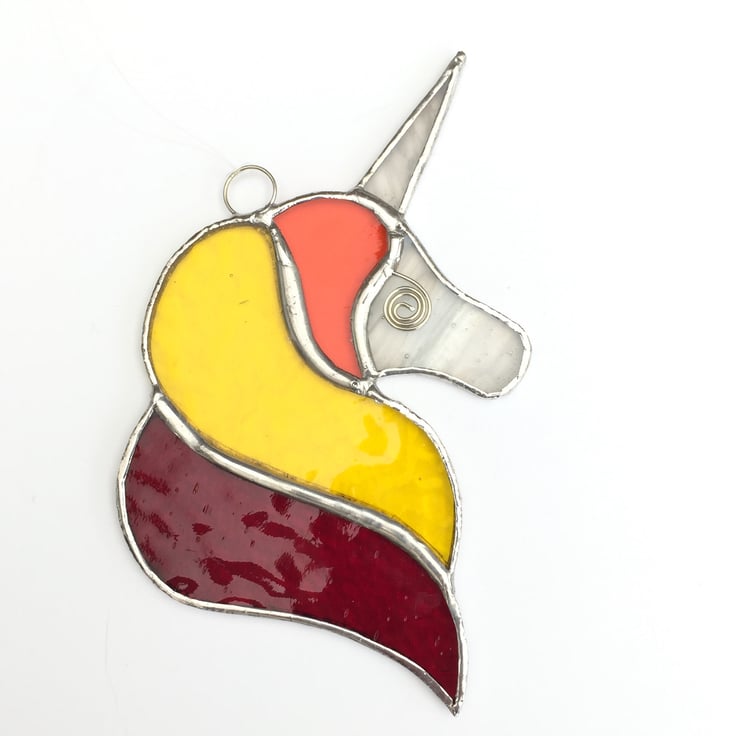 This unicorn has been made with orange water glass, yellow corrella glass, red textured glass and white streaky glass.