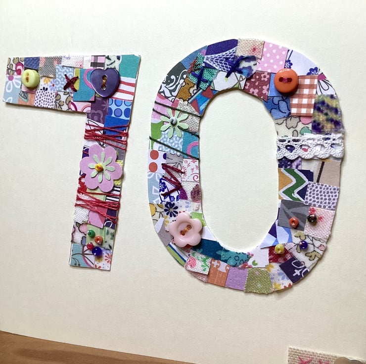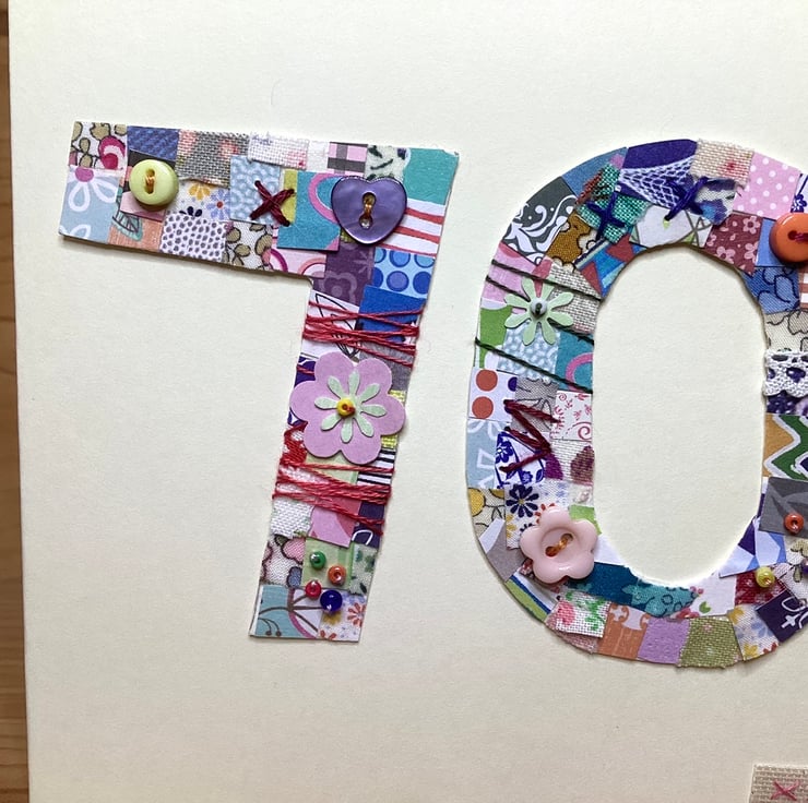 This beautifully detailed card is handmade with squares of patterned papers and fabrics embellished with buttons, beads and stitching. It is the perfect way to send congratulations for a special birthday. It measures 12.5cm x 12.5cm and is made on cream card, with cream envelope and comes in a cello wrap. It is left blank inside for your own wording