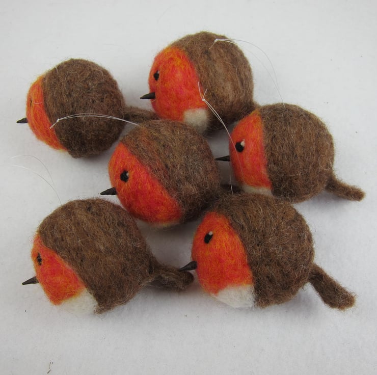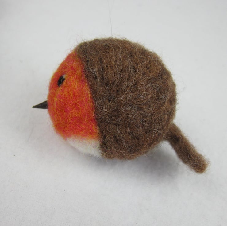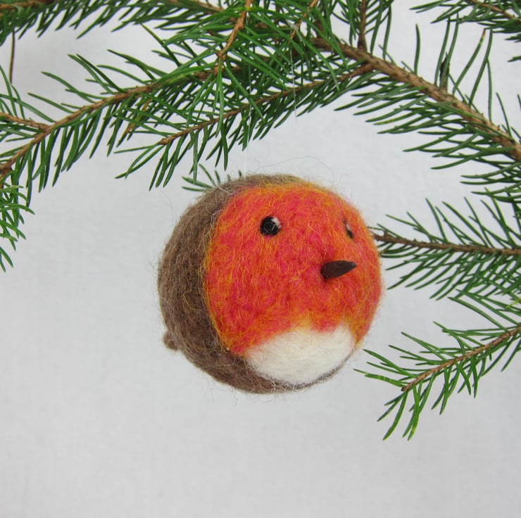 A sweet little robin redbreast to hang from your tree. This bauble has been needle felted using corriedale fibres over core wool using a barbed felting needle. Brown fibres have been used for the main body and the tail with a blend of orange and red for the breast with a flash of white below. Black eyes and a brown beak have been added. The bauble measures approximately 6cm (2.25") in diameter and has a nylon thread attached for hanging.