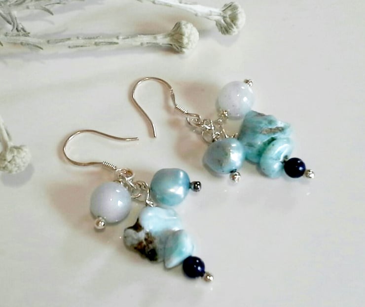 A beautiful pair of unique cluster earrings designed and hand crafted using exceptionally rare larimar nuggets, freshwater culture pearls and aquamarine round gemstones. All components to make them are 925 sterling silver.