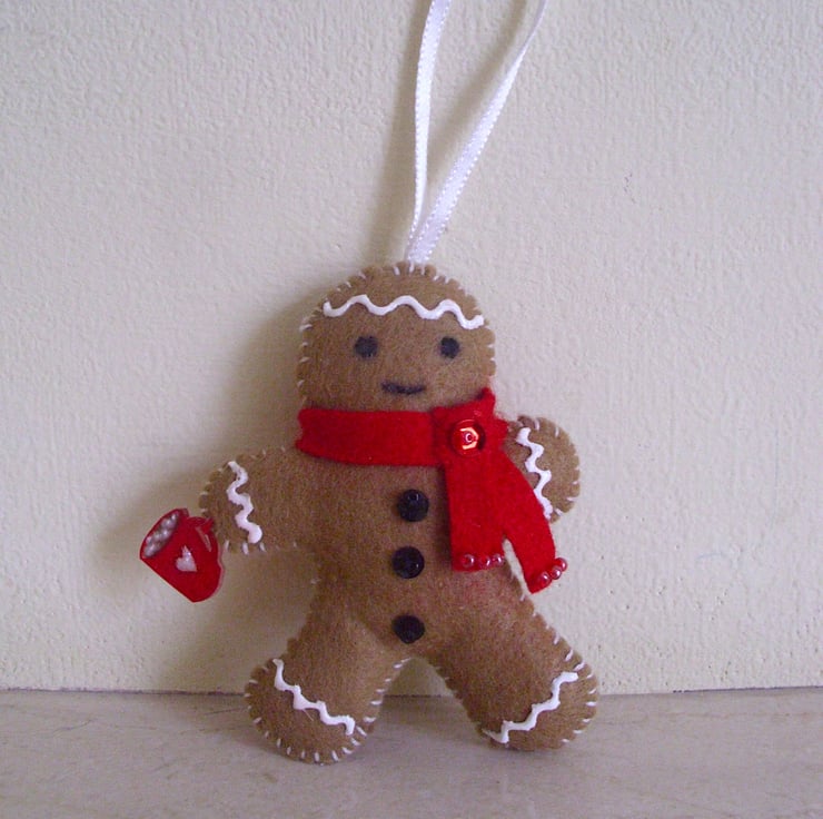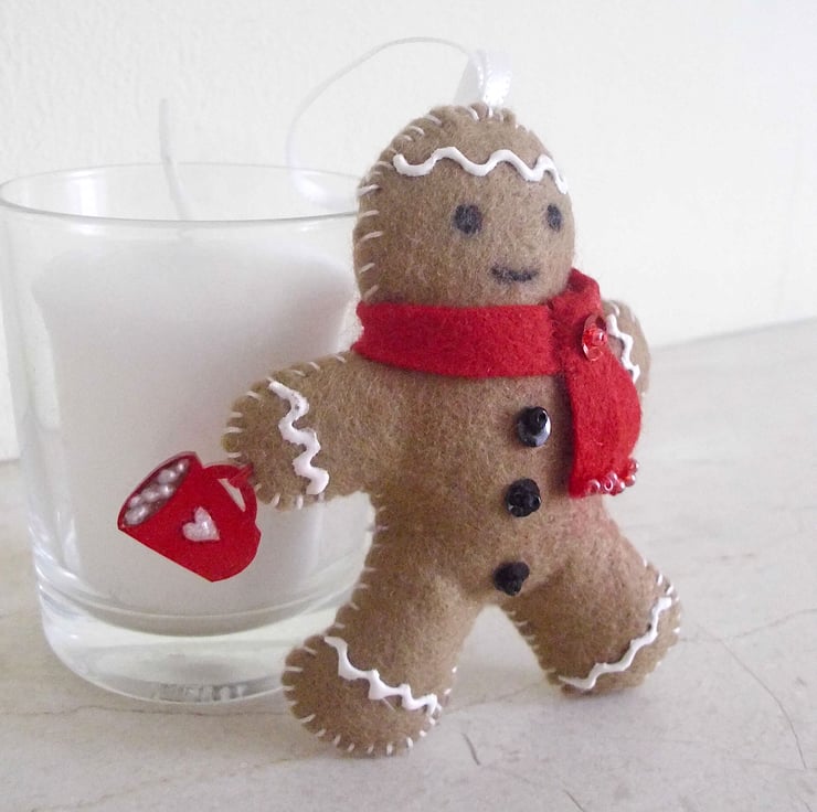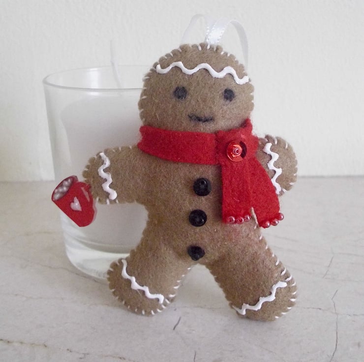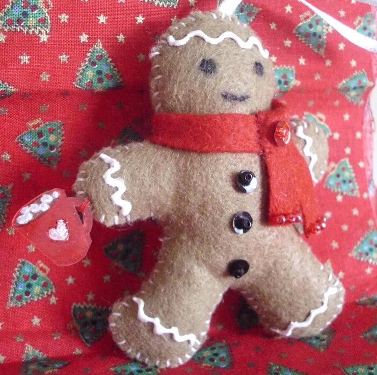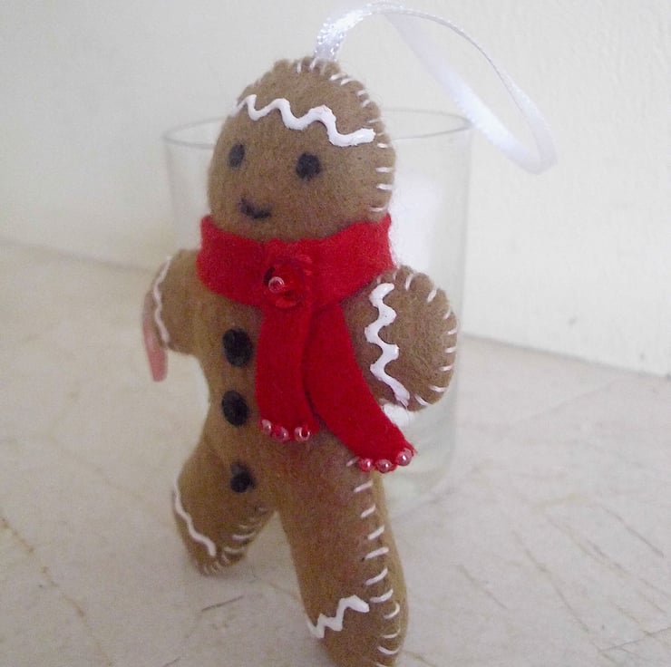 Hand cut and stitched felt fabric, embellished with stitched facial features, red felt scarf with sequins and beads, black sequin and bead buttons, fabric painted faux icing and white ribbon to hang.