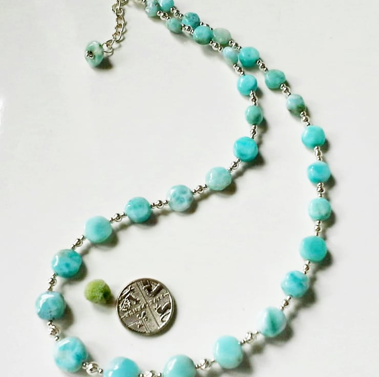 This AA grade larimar necklace has been designed and hand crafted in Cornwall using irregular cut coin shaped rounds which graduate in size from front to back. Each gemstones colour is beautiful and completly natural with no enhancement treatments applied Between each gemstone are sterling silver beads to add a touch of sparkle. The largest centre gemstones are approximately 10mm in diameter.