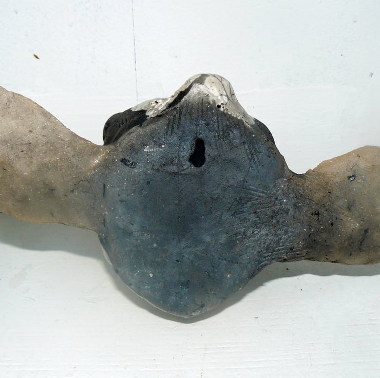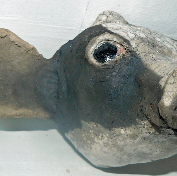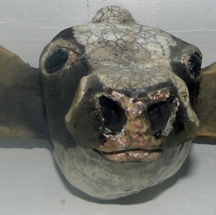 Cows head made by the `modelling` technique. 21 x 13 x 12cms. Later raku fired. There is a hole & space in the back for the piece to hang from the wall.